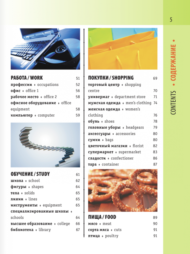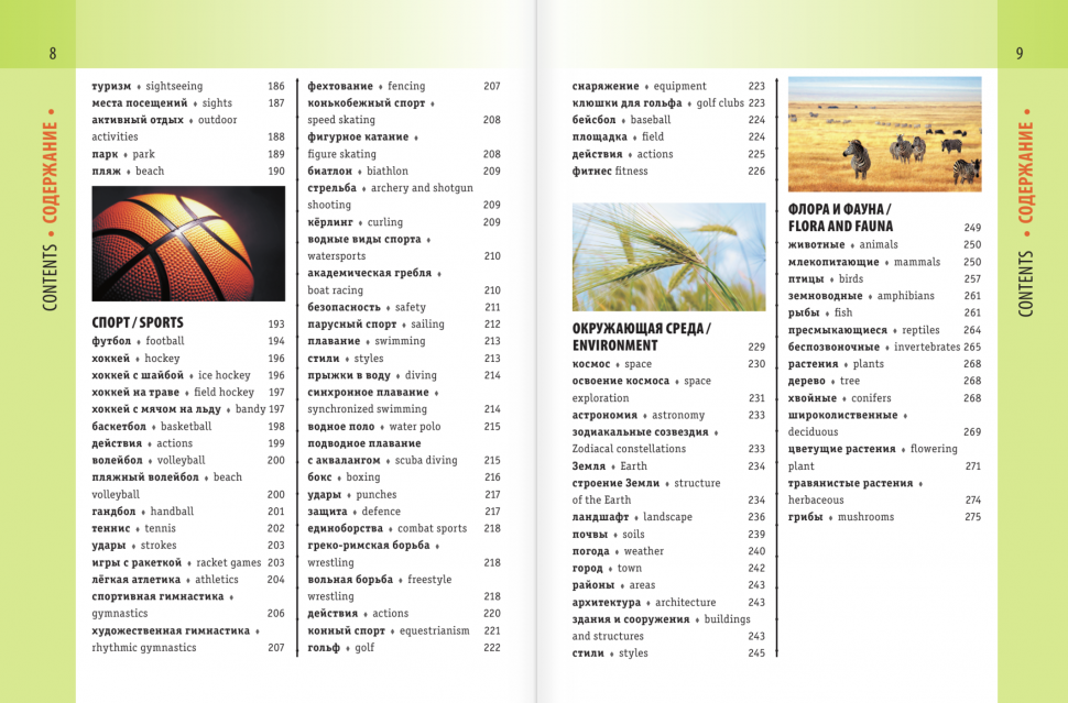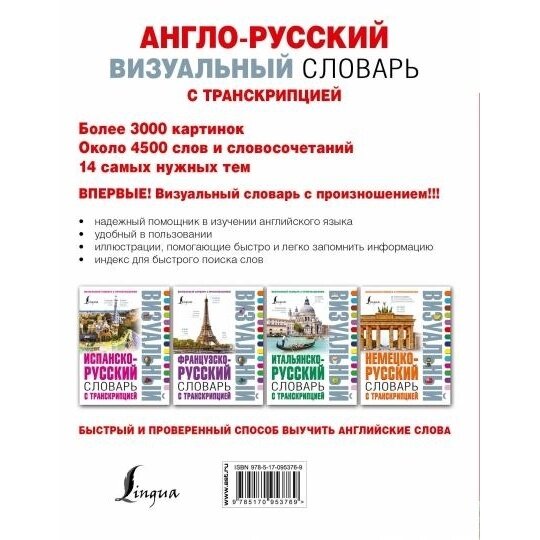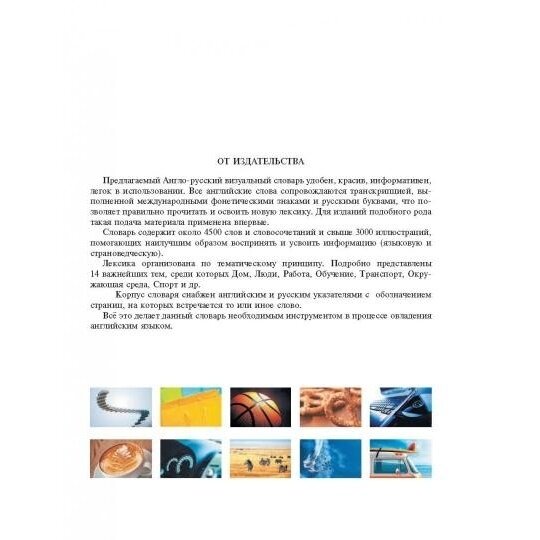 Англо-русский визуальный словарь содержит около 4500 слов и словосочетаний и более 3000 картинок, помогающих быстро и легко запомнить информацию. Подробно представлены 14 самых нужных тем, среди них Дом, Люди, Здоровье, Работа, Обучение, Покупки, Транспорт, Досуг, Спорт, Окружающая среда. Впервые в издании подобного рода все английские слова даны с транскрипцией, выполненной в международных фонетических знаках и русскими буквами. Корпус словаря снабжен английским и русским указателями. Издание предназначено для всех, кто изучает английский язык.