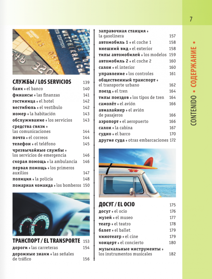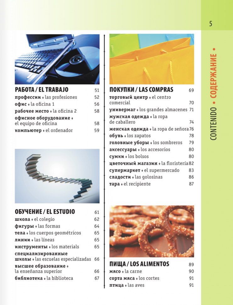 Испанско-русский визуальный словарь содержит около 4500 слов и словосочетаний и более 3000 картинок, помогающих быстро и легко запомнить информацию. Подробно представлены 14 самых нужных тем, среди них Дом, Люди, Здоровье, Работа, Обучение, Покупки, Транспорт, Досуг и Спорт. Впервые в издании подобного рода все испанские слова даны с произношением, которое передано русскими буквами. Корпус словаря снабжен испанским и русским указателями. Издание предназначено для всех, кто изучает испанский язык.