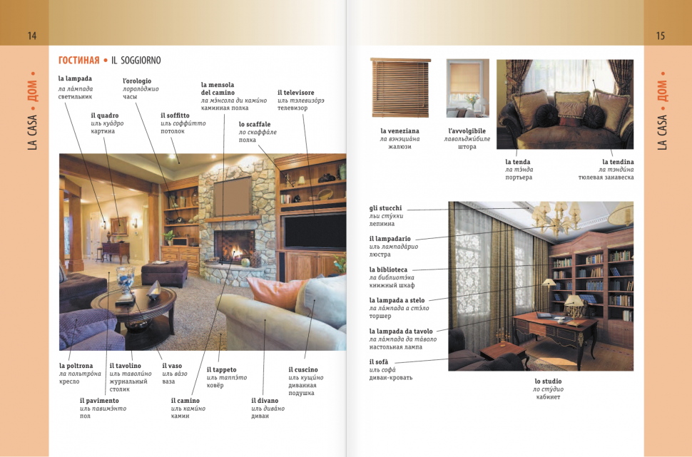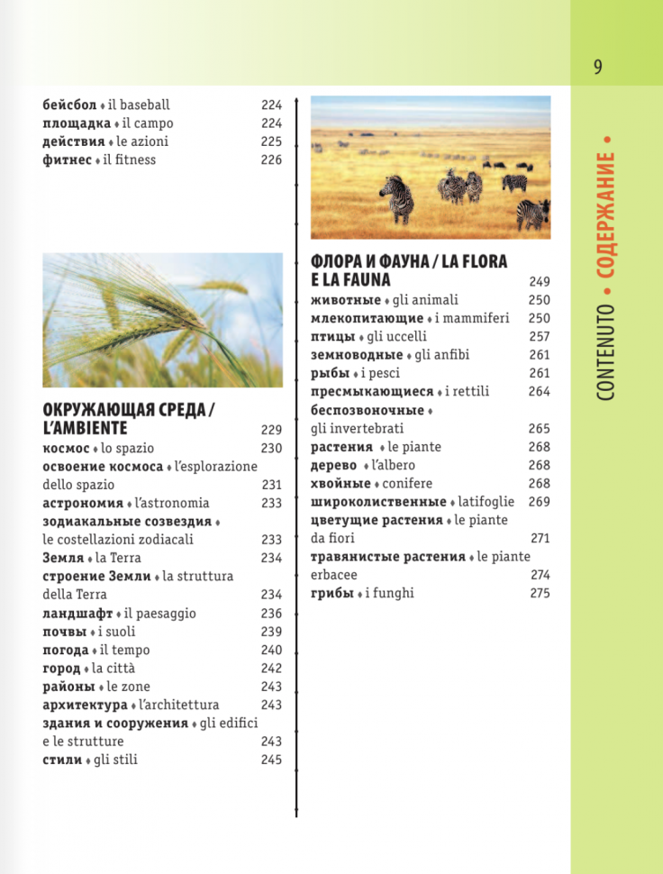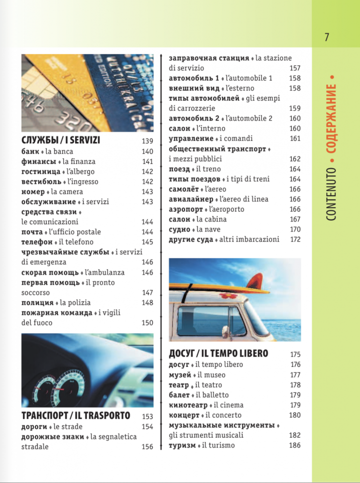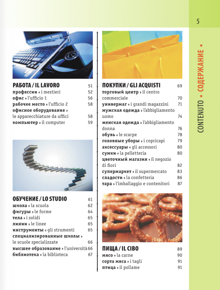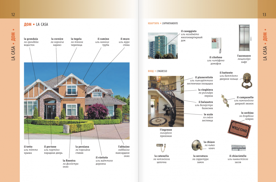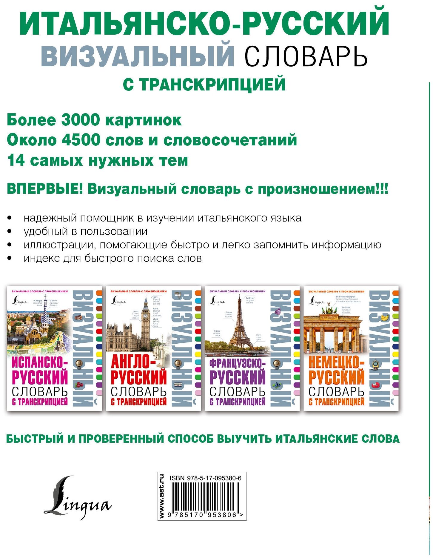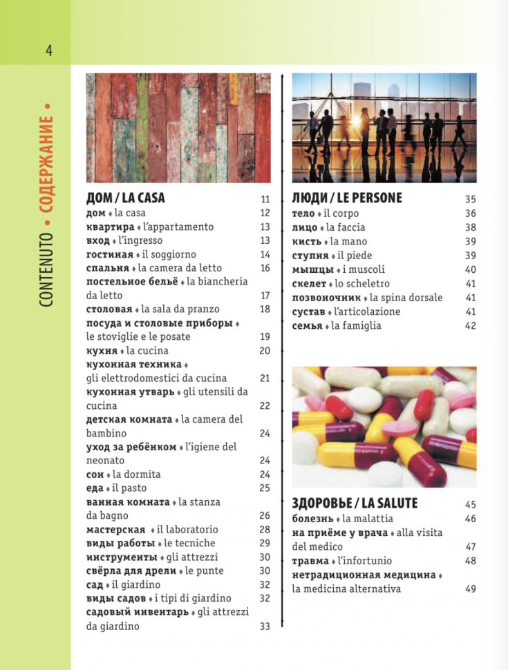 Итальянско-русский визуальный словарь содержит около 4500 слов и словосочетаний и более 3000 картинок, помогающих быстро и легко запомнить информацию. Подробно представлены 14 самых нужных тем, среди них Дом, Люди, Здоровье, Работа, Обучение, Покупки, Транспорт, Досуг и Спорт. Впервые в издании подобного рода все итальянские слова даны с произношением, которое передано русскими буквами. Корпус словаря снабжен итальянским и русским указателями. Издание предназначено для всех, кто изучает итальянский язык.
