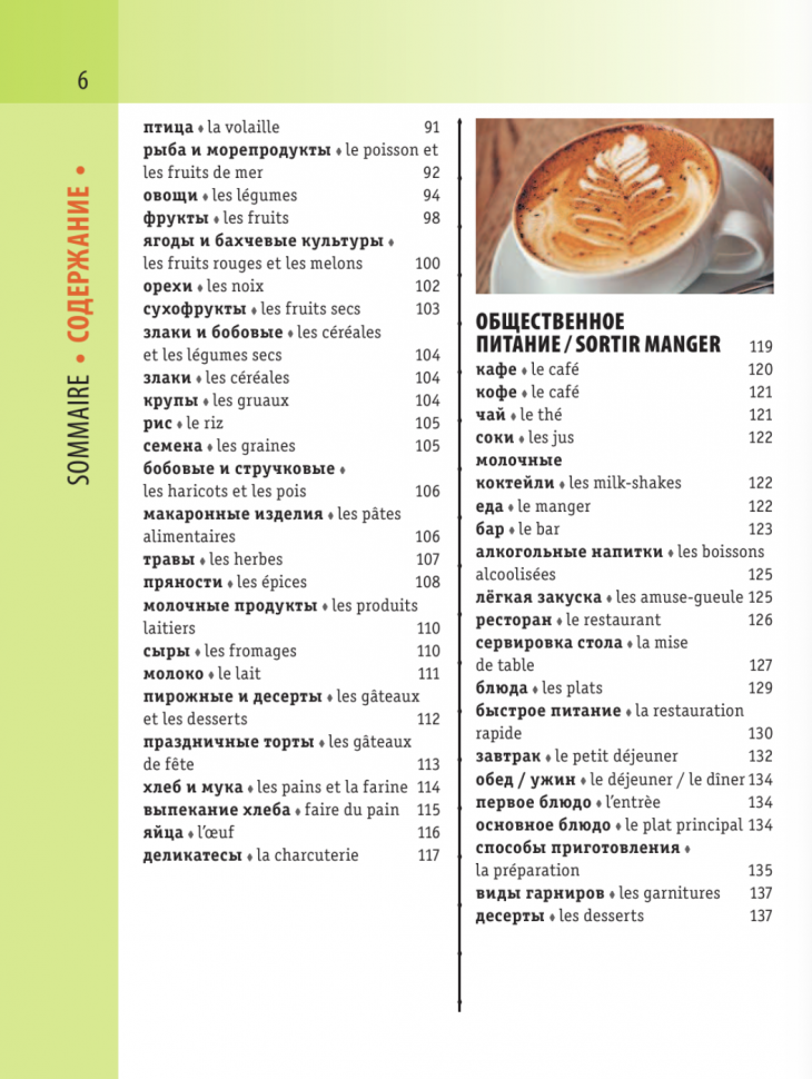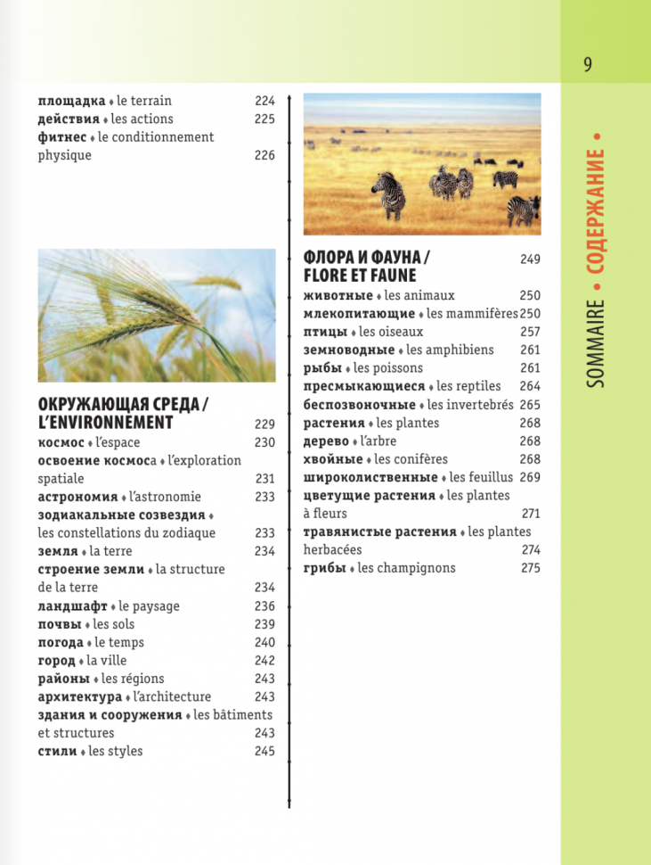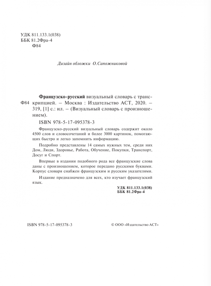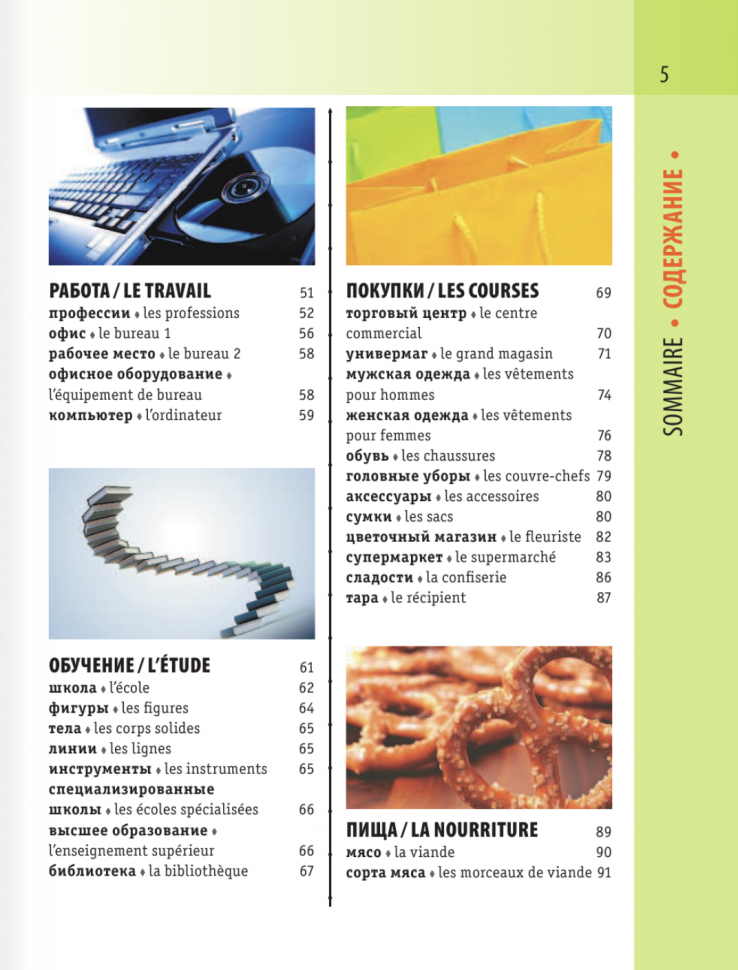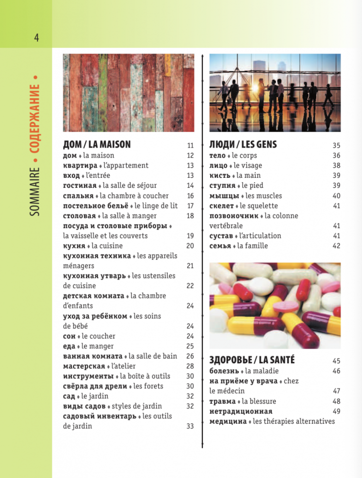 Французско-русский визуальный словарь содержит около 4500 слов и словосочетаний и более 3000 картинок, помогающих быстро и легко запомнить информацию. Подробно представлены 14 самых нужных тем, среди них Дом, Люди, Здоровье, Работа, Обучение, Покупки, Транспорт, Досуг и Спорт. Впервые в издании подобного рода все французские слова даны с произношением, которое передано русскими буквами. Корпус словаря снабжен французским и русским указателями. Издание предназначено для всех, кто изучает французский язык.