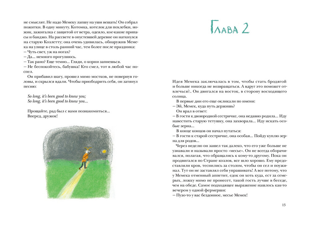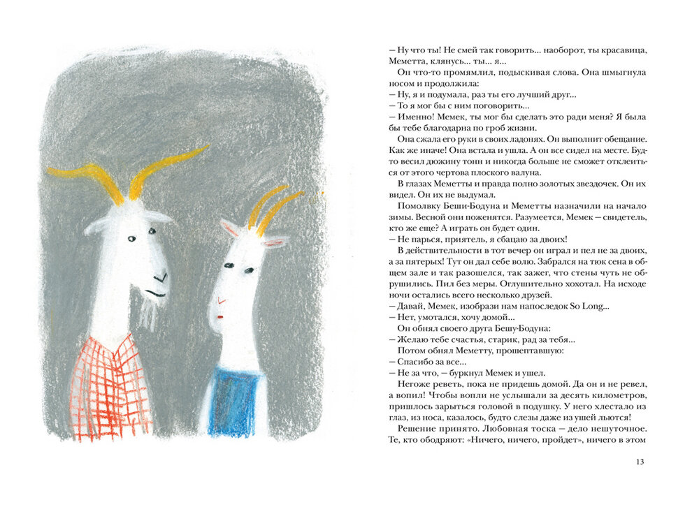 В стране козлов живет наш герой Мемек. Он музыкант и просто веселый парень. Но вот случается с ним любовь, заставившая его покинуть свою страну и идти, куда глаза глядят. Тут идут очень серьезные размышления о любви, о семье, о разбитом сердце. Ничего пошлого. Скорее как то по-настоящему. Думаю, многие подростки узнают свои мысли. Про любовь несколько страниц, а дальше приключения.
