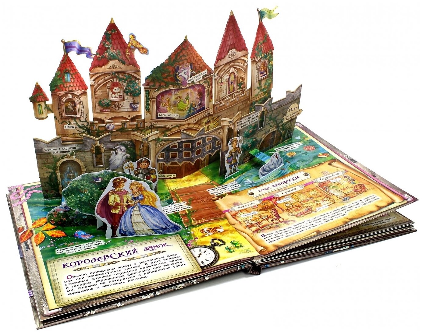 Также в книге - письмо и сертификат от принцессы Мэри Златовласки, объёмный королевский замок, раскрывающиеся медальоны и шкатулки, настольная игра "Сказочный мир" с картами и раскладным игровым полем.