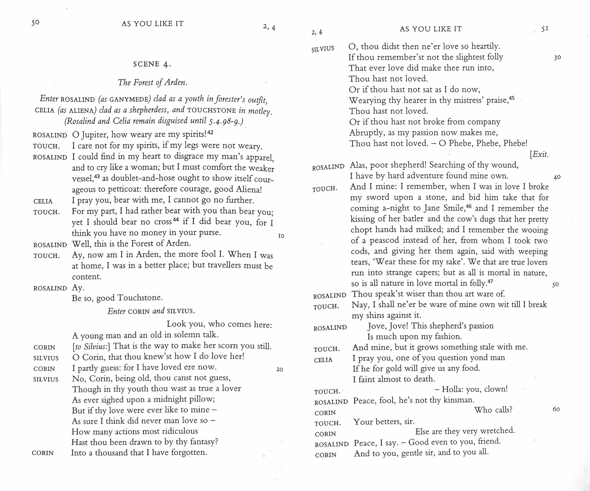 Как и в "Сне в летнюю ночь", "Гамлете" и "Антонии и Клеопатре", Шекспир в "As You Kile It" соединяет разрозненные элементы в необычной пропорции в единое целое. Но именно в этой пьесе мне нравится, как развивается традиционно напряженный сюжет: в комплекте с злодеями, поединками и влюбленными. Действие несётся с головокружительной скоростью по всему первому акту, а затем замедляется, замедляется… Особенно, когда сюжет достигает Арденского леса. Так и должно быть, поскольку этот лес — волшебное место, где время останавливается, а любовь растет. Представляете, как это описано на языке великого Шекспира?