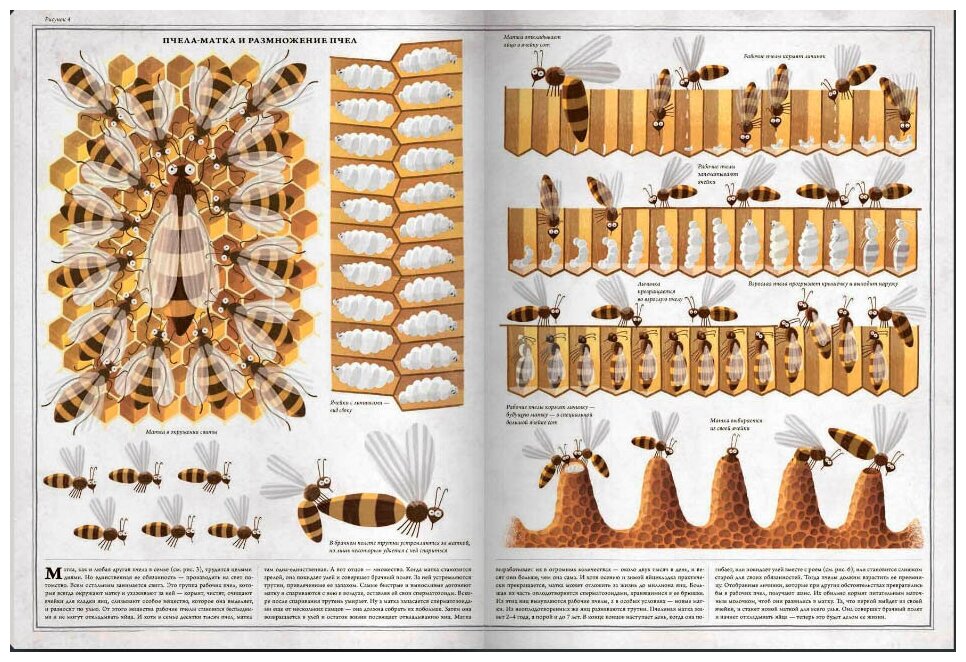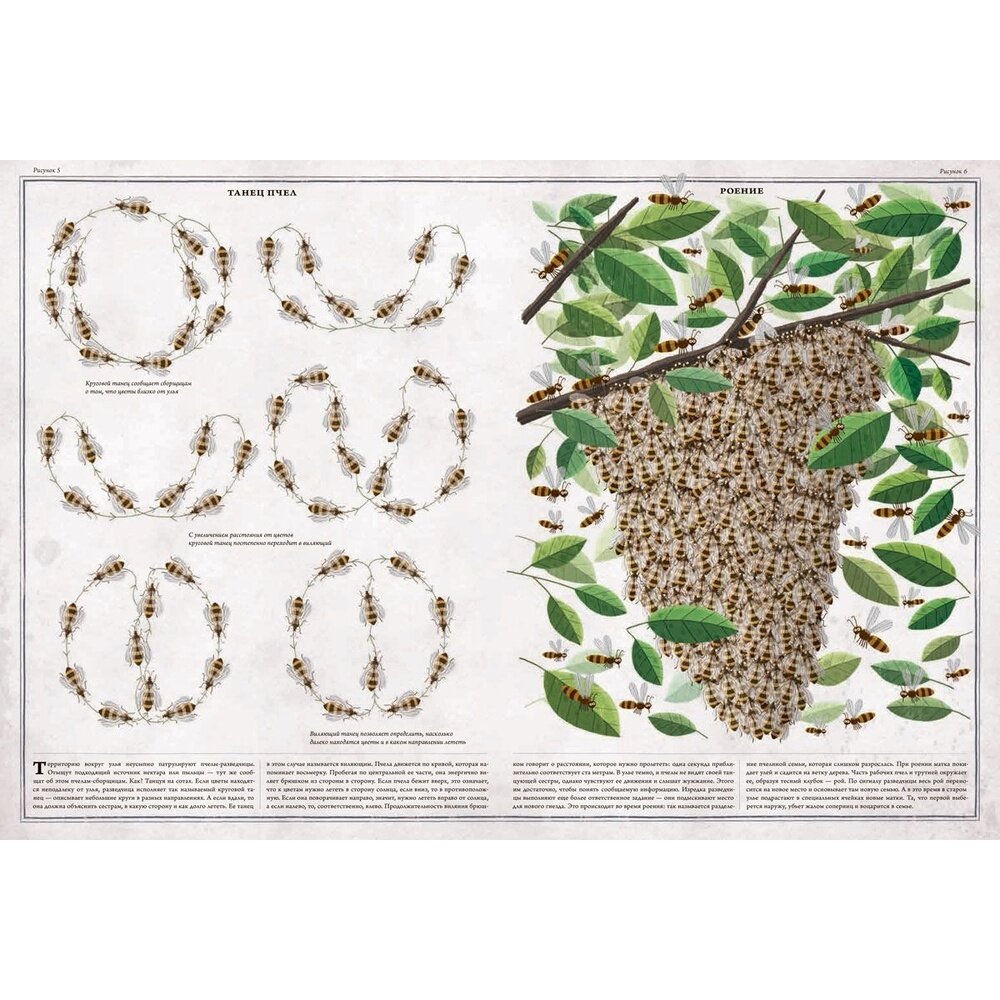 "Пчёлы" - книга картинка польского художника-иллюстратора Петра Сохи (Piotr Socha), которую он создал вместе с ученым-биологом Войцехом Грайковским (Wojciech Grajkowski). В ней 30 больших разворотов с иллюстрациями (размер книги - 275х375 мм), в которых рассказано об удивительных и интересных насекомых, жизнь которых тесно связана с человеческой деятельностью вот уже несколько тысячелетий. Как устроена пчелиная семья и улей, как пчелы общаются между собой, чем полезен мед, как работает пчеловод, чем мы вообще обязаны пчелам. Каждая иллюстрация - не просто картинка, это рассказ с большим количеством красочных деталей, дополненный небольшим, но очень информативным текстом.