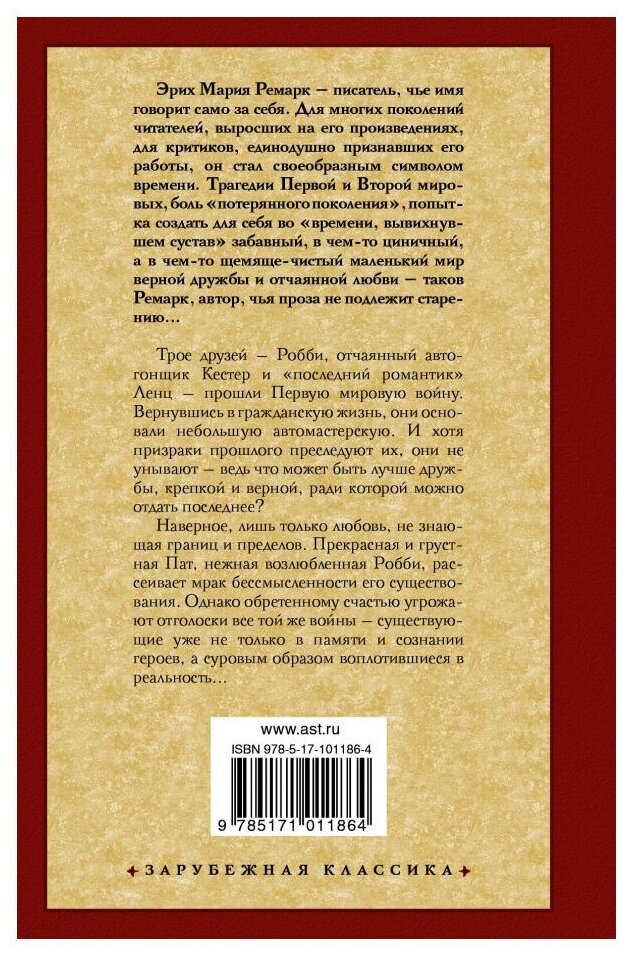 ... Дружили три товарища ... Пронзительная, как собственно и все произведения Ремарка о послевоенной действительности Европы, история о трёх молодых парнях и одной девушке, которая вроде бы подруга одного, но любят-то её на самом деле и соревнуются за её внимание и благосклонность все трое. А она и сама ещё ничего не решила. И все это на фоне грандиозного упадка прежде всего Германии после Первой Мировой войны. Как однозначно следует из этого романа именно эта безнадёга и разруха и привела ко Второй Мировой войне, так как не только вся повседневная жизнь, но и чувство собственного достоинства педантичных, упорядоченных и аккуратных немцев было просто растоптано и изничтожено. И в это лихолетье ничего больше не остаётся кроме любви и дружбы, о которой и повествует произведение.