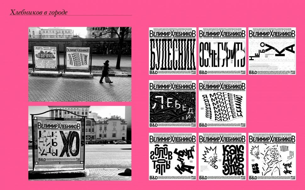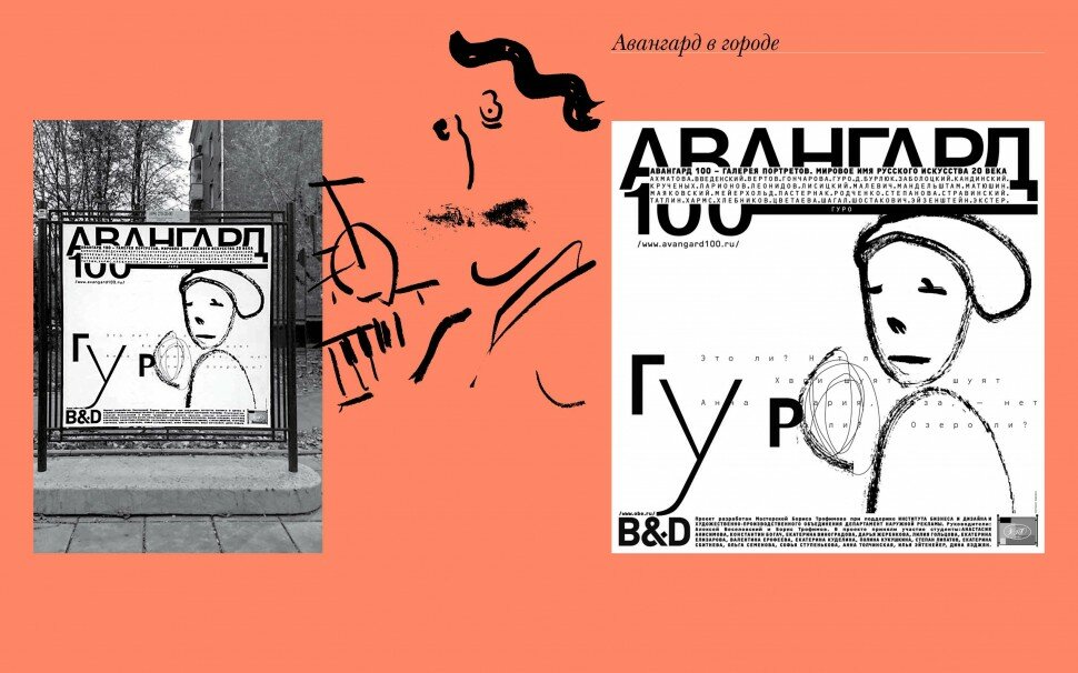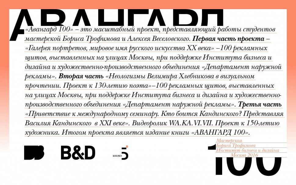 Этот масштабный проект, реализованный мастерской Бориса Трофимова, представляет работы студентов - от графических листов и серий брошюр до рекламных щитов, украсивших улицы Москвы. Впервые он был показан на международном фестивале TYPOMANIA - 2015; второй показ, дополненный новыми именами мастеров авангарда, прошел в Институте Бизнеса и Дизайна; и, наконец, 100 щитов с изображениями работ, участвующих в проекте, были выставлены в Москве Департаментом наружной рекламы. Своего рода итогом проекта является издание книги.