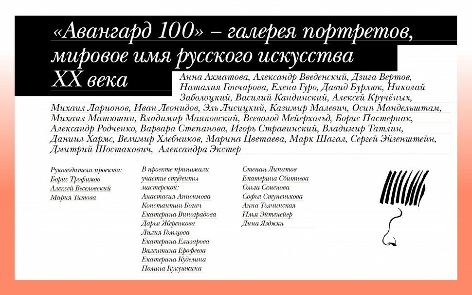 Авангард 100 - это масштабный проект, представляющий работы студентов мастерской Бориса Трофимова и Алексея Веселовского (Институт Бизнеса и Дизайна). Это не только галерея портретов мастеров художественного направления в искусстве начала 20 века, это авангард русской культуры, первые имена. Имена, которые вдохновляли студентов мастерской на творческий поиск и оригинальные решения в области графического дизайна.