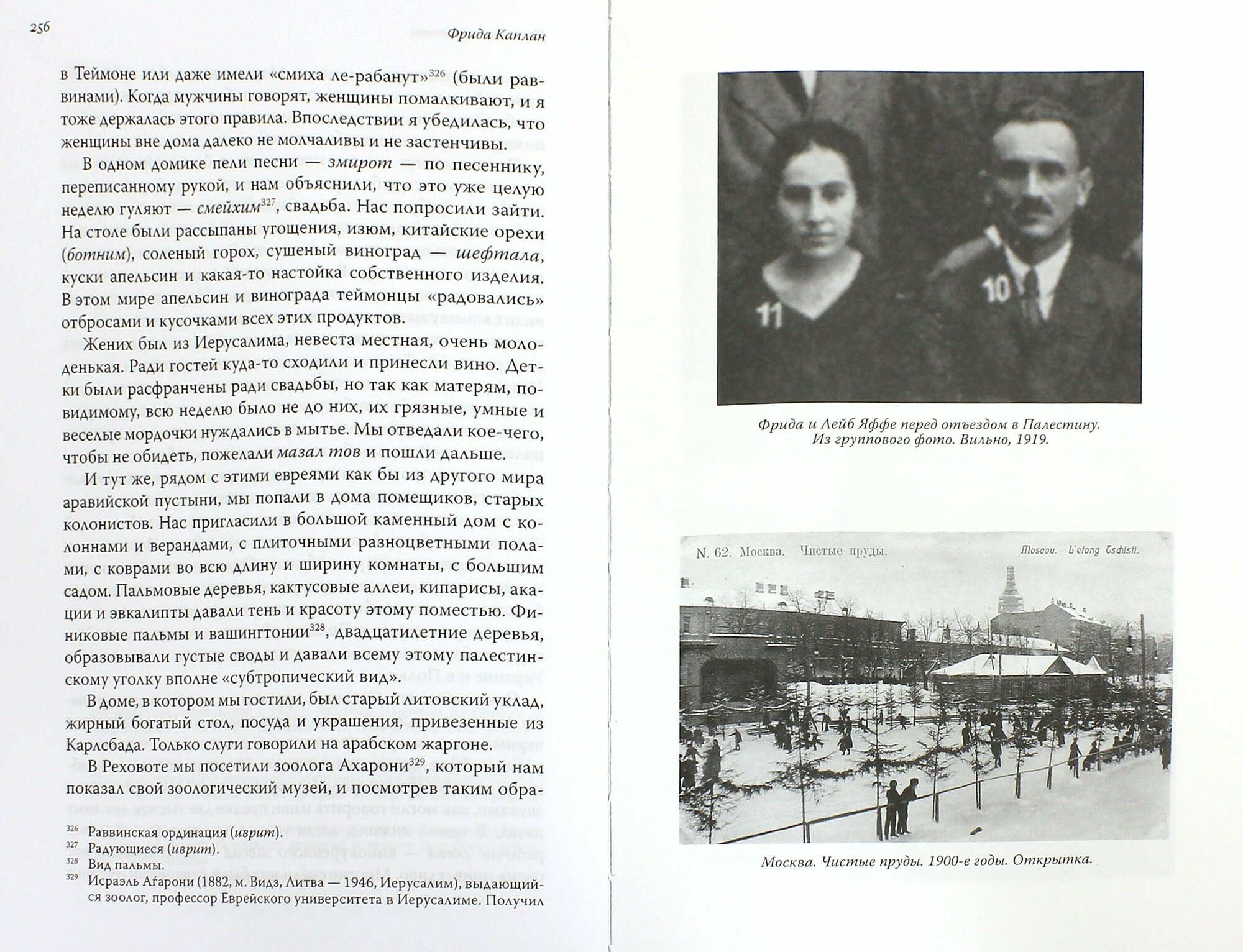 Фрида Вениаминовна Яффе, в девичестве Каплан (1892-1982), родилась в Москве в доме деда, богатого купца первой гильдии. Получила добротное образование, с юности свободно владела французским и немецким и в семнадцать лет, не имея гимназического аттестата, стала вольнослушательницей историко-философского факультета в университете в Лозанне, где проучилась год. Затем в Петербурге сдала экстерном экзамены на аттестат в министерской гимназии имени Великой Княгини Евгении Максимилиановны и уехала в Вильну, а оттуда - в Германию. Девятнадцати лет Фрида была принята на Высшие женские курсы Полторацкой в Москве. 2 января 1920 года вместе с мужем Лейбом Яффе прибыла в Палестину.