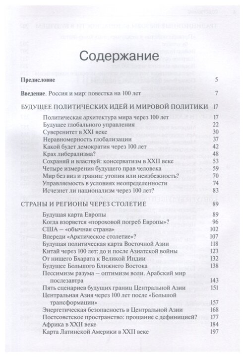 Издание включает в себя 55 статей, затрагивающих различные аспекты международной и общественной жизни в столетней перспективе. Прогнозы, сделанные авторами, указывают на ключевые тенденции развития человечества. Издание будет представлять интерес экспертам-международникам, госслужащим, журналистам и всем заинтересованным в изучении будущего и анализе долгосрочных мировых тенденций.