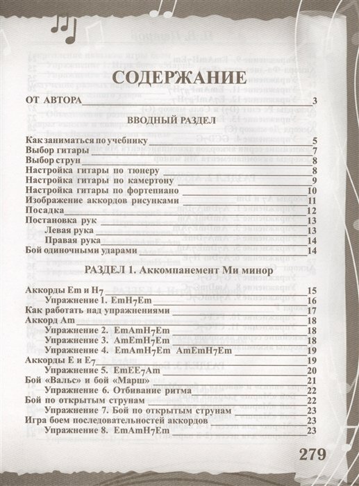 Достаточно понятный самоучитель. Много упражнений, которые позволяют изучить азы игры на гитаре достаточно подробно и поэтапно. Не хватает, на мой взгляд, цветной визуализации, немного серовато, но это вкусовщина и на материал, его качество и подачу это никак не влияет.