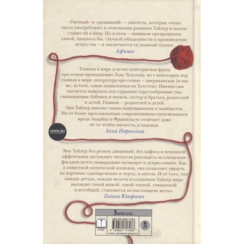 Энн Тайлер без резких движений, без пафоса и ненужной аффектации заставляет читателя разглядеть за глянцевым фасадом нечто невыразимо пугающее и депрессивное. Как в известной оптической иллюзии, она позволяет увидеть на картинке одновременно и черта, и ангела. И от того, что каждая деталь, каждая мелочь в созданном Тайлер мире выглядит такой живой, такой теплой, узнаваемой и всеобщей, становится по-настоящему жутко. Галина Юзефович