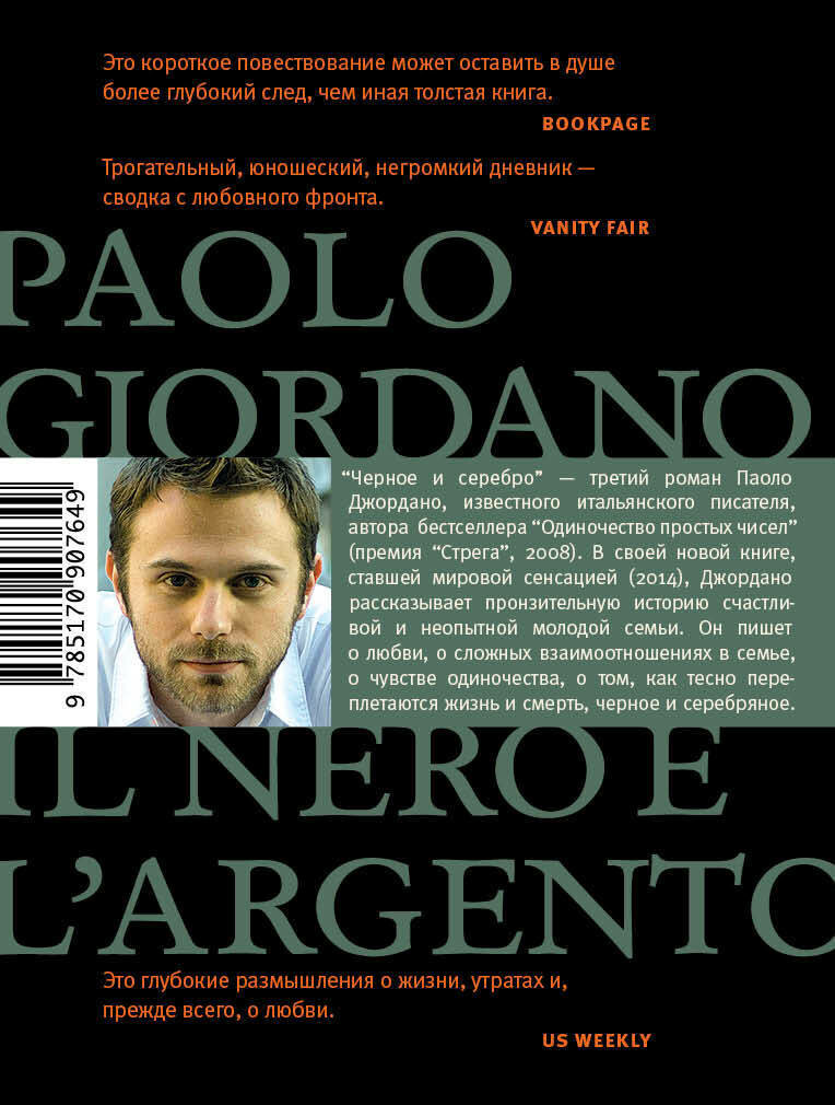 Центральный персонаж этого глубокого и пронзительного романа - синьора А., вдова, которая работает прислугой в семье рассказчика и его жены, Норы, а после рождения сына - няней. Вскоре синьора А. становится твердой опорой и родным человеком, удерживающим от распада эту молодую семью. Роман Паоло Джордано автобиографичен: "Синьора А. действительно присутствовала в моей жизни. Несколько лет она провела в моем доме, с моей семьей, потом ей пришлось покинуть нас. Эта книга вдохновлена ее историей. Она была задумана как дань уважения к ней, как возможность подольше сохранить ее в моей памяти". "Черное и серебро" - роман, ставший мировой сенсацией (2014), подтверждает силу и хрупкость любви, заставляя читателя задуматься о том, которую роль играют в его жизни другие люди.
