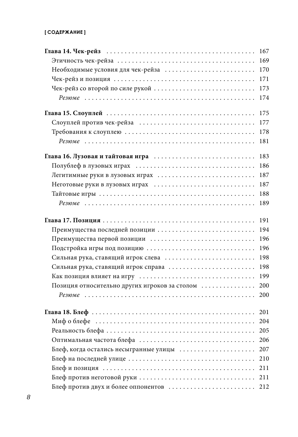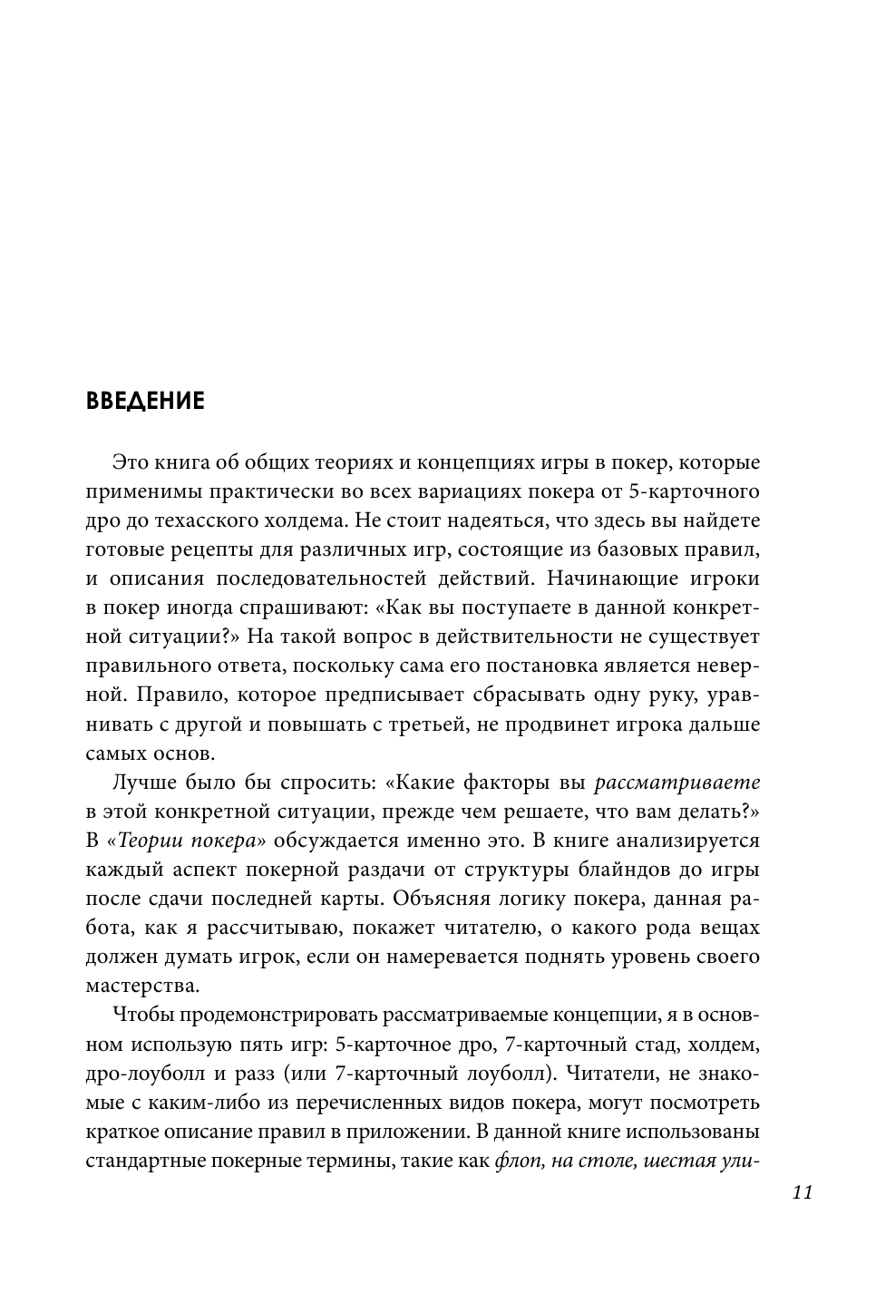 Очень неудачный перевод названия - в оригинале The theory of poker (Теория покера). Книга супер бестселлер, "Библия покера". Лучшая книга для тех, кто хочет узнать об этой карточной игре больше и не желает слепо полагаться на удачу. Автор рассматривает на примере десятков вариаций игры(от популярного техасского холдема, до экзотических лоуболлов) многочисленные типовые приемы, суть математического ожидания и прикладной теории вероятности, но главное - схемы того, как должен мыслить успешный игрок за столом и вне его.