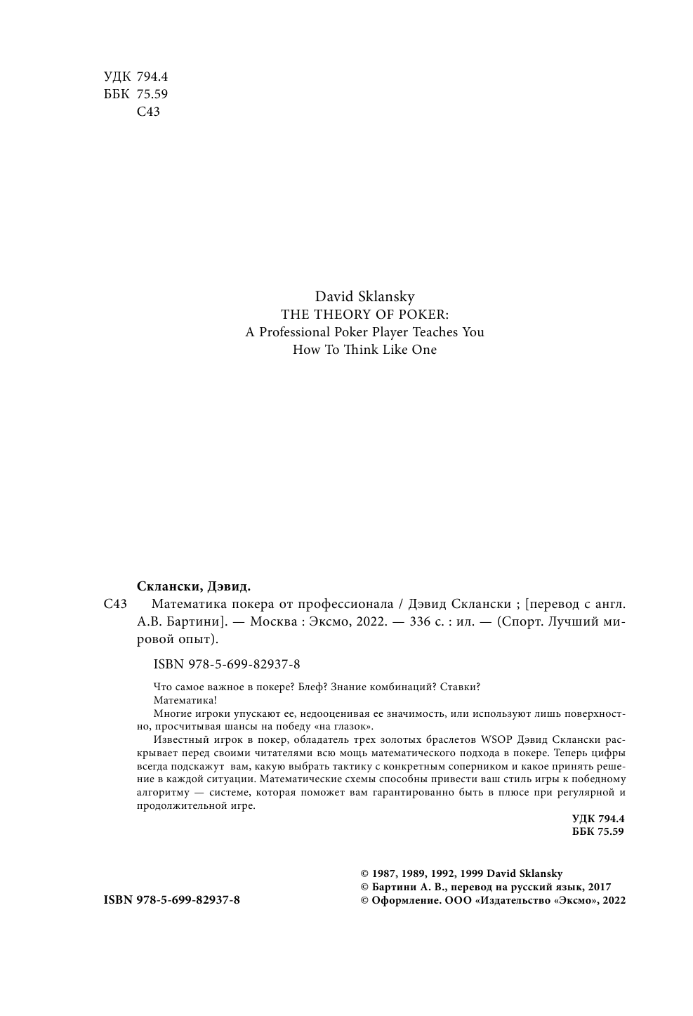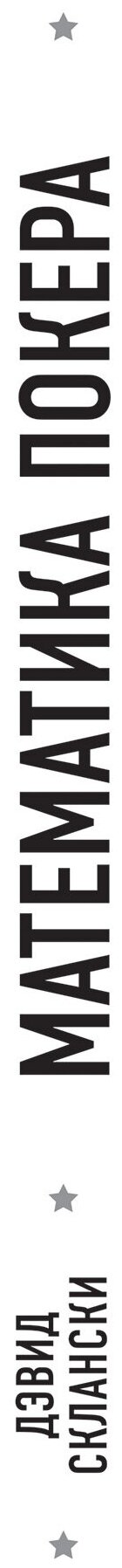 Известный игрок в покер, обладатель трех золотых браслетов WSOP - Дэвид Склански, раскрывает перед своим читателями всю мощь математического подхода в покере. Теперь цифры всегда подскажут вам какую выбрать тактику с конкретным соперником и какое принять решение в каждой ситуации. Математические схемы способны привести ваш стиль игры к победному алгоритму - системе, которая поможет вам гарантированно быть в плюсе при регулярной и продолжительной игре.