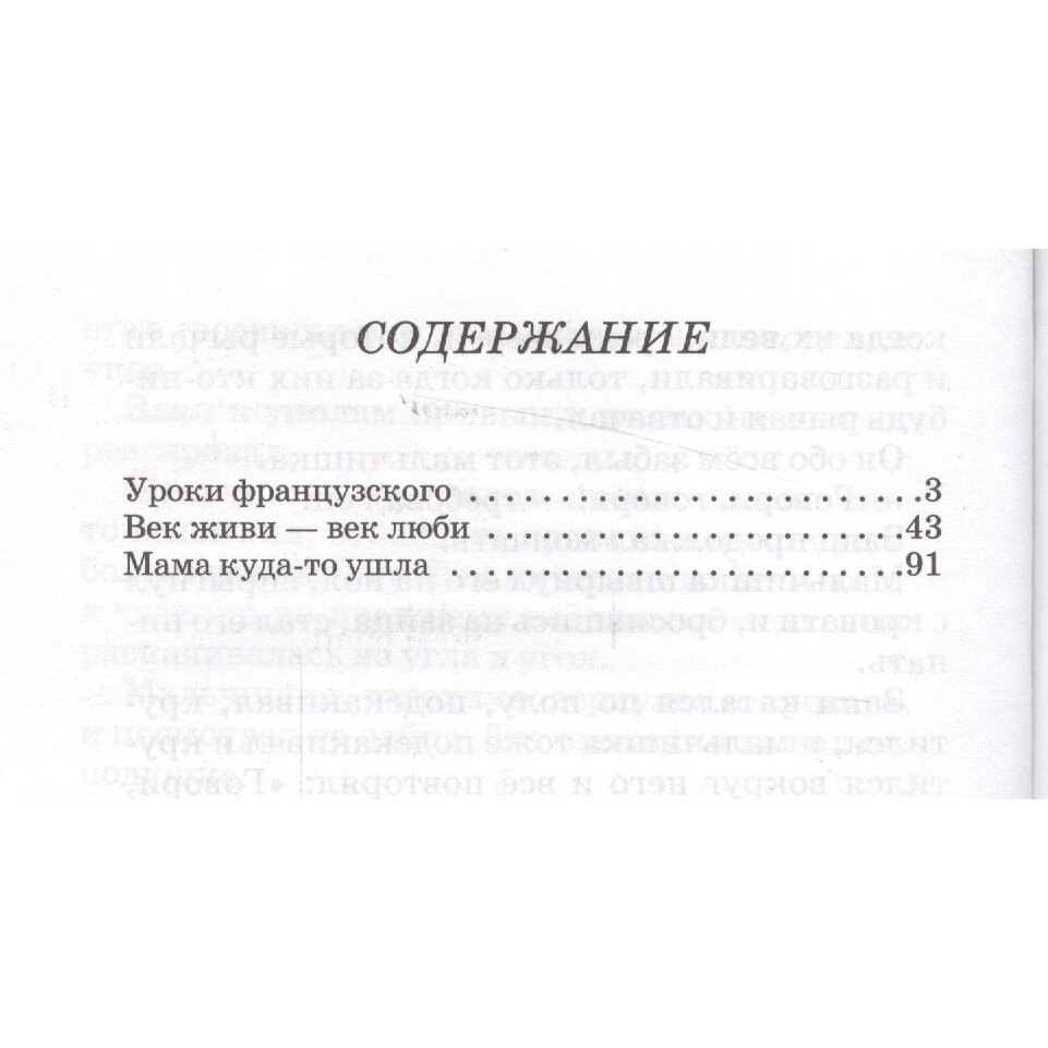 В книгу выдающегося мастера современной художественной литературы Валентина Григорьевича Распутина (1937-2015) вошли произведения школьной программы: "Уроки французского", "Век живи - век люби" и "Мама куда-то ушла". Это рассказы о детстве, о ребятах, оказавшихся в непростых жизненных ситуациях. Главная их тема - справедливость, чувство собственного достоинства, доброта, умение доверять и помогать друг другу.