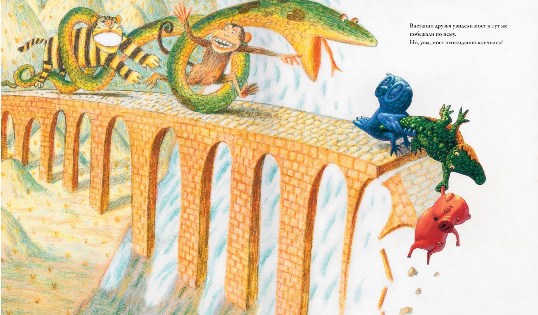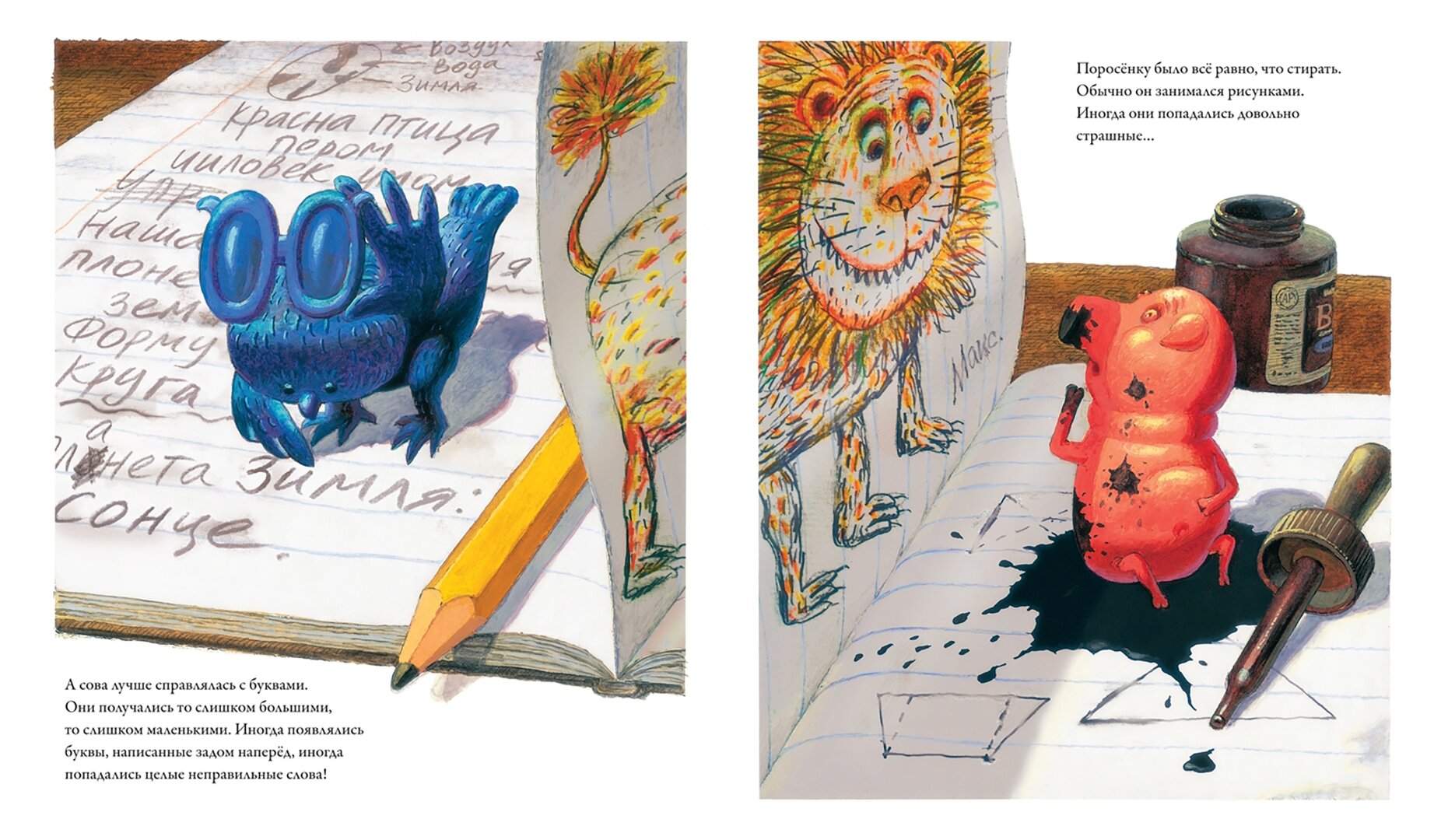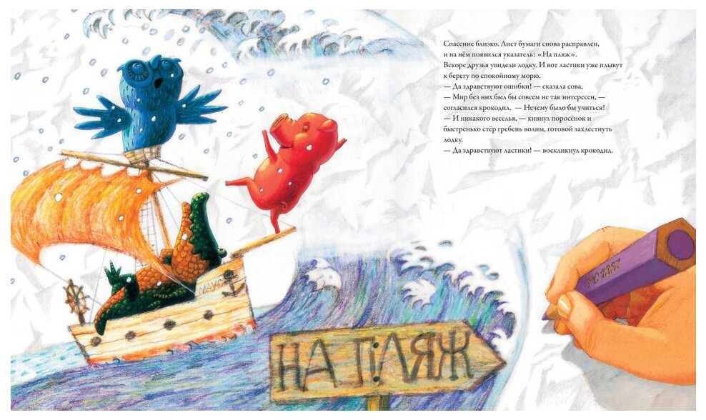 Это одна из тех книг, где авторский текст – трамплин, оттолкнувшись от которого, ребенок нырнет в океан воображения и поможет сочинять данную историю и придумает свои. Рисунки очень эффектны, они будто, в самом деле, оживают, почва уходит из-под ног, ты падаешь, тебя накрывает с головой волна. Первым сюрпризом был титульный лист. Название книги на нем перевернуто вверх ногами, оно написано в тетради, лежащей перед кем-то по ту сторону стола. Сразу чувствую себя учителем, остановившимся перед партой. Посмеялась над Совой, снявшей очки в изумлении над таким количеством ошибок, над довольным Поросенком в чернильной луже. И очень захотелось порисовать. Большое спасибо художнику с русской фамилией Борису Куликову много лет живущему в Америке. -