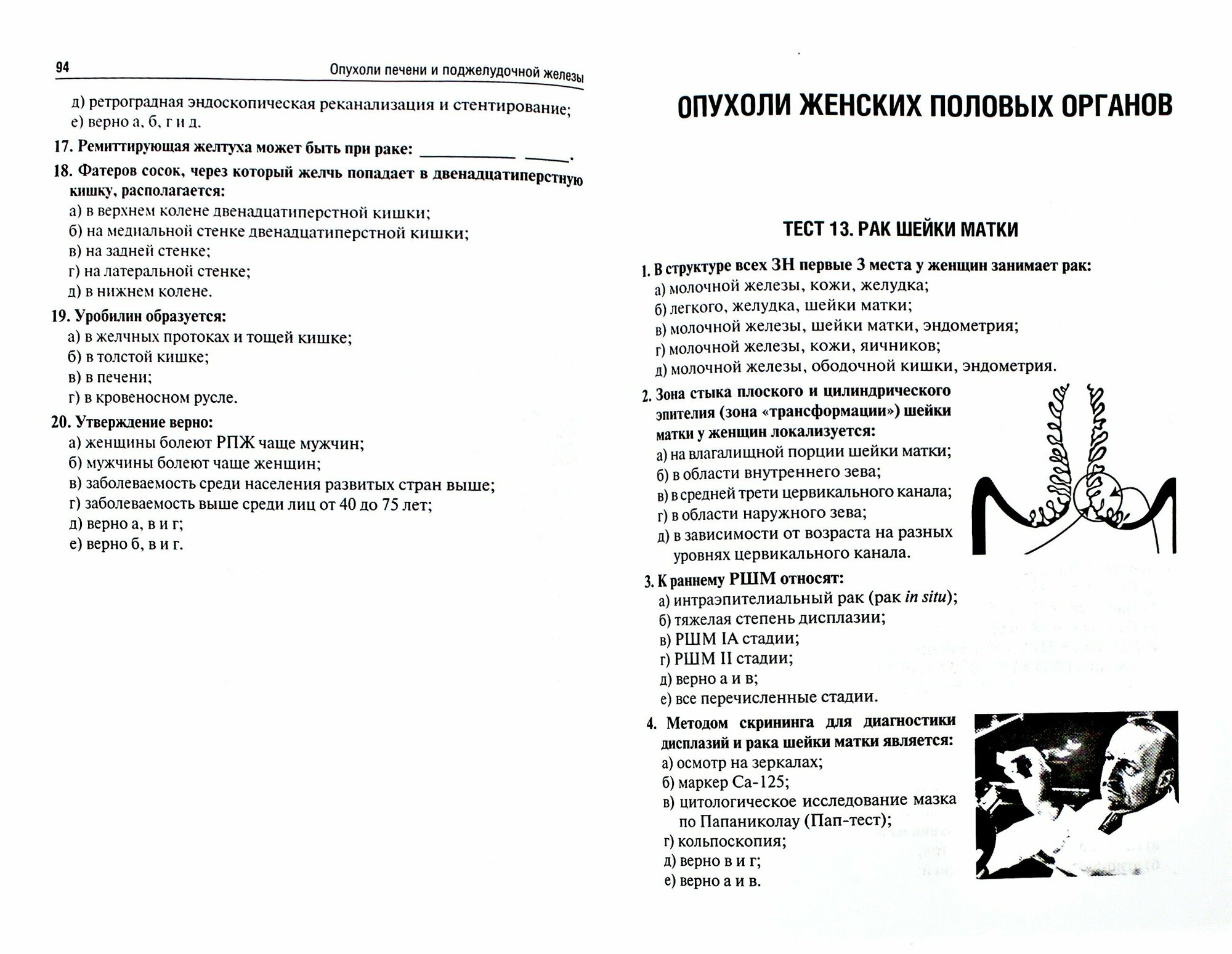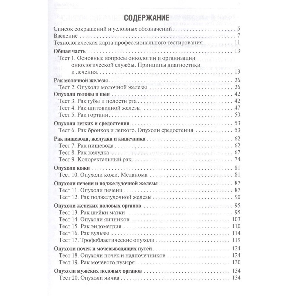 Особое место занимают тесты, посвященные новым технологиям (фотодинамической диагностике и фотодинамической терапии, лазерной терапии, интервенционной радиологии и др.), вопросам побочных действий специального лечения, паллиативной терапии.
