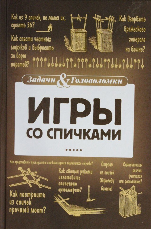 Задачи есть как на внимательность, так и требующие определенных познаний, причем даже в области истории спорта (например, в одной из задач необходимо представить 13 спичками одного знаменитого стрелка. Правильный ответ - ТЕЛЛЬ. Оказывается это народный герой Швейцарии), или в географии (например, нужно составить из 8 спичек большую реку) и т.д. Но в основном всё же задачки рассчитаны на сообразительность. Также здесь встречаются фокусы, опыты (особенно интересны опыты с надломленными спичками), описывается процедура возведения сооружений из спичек (мост, домики, башенки и т.д.) или игрушечной мебели из спичек и картона.