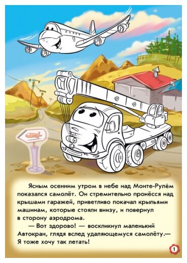 Нижняя треть страниц отведена под текст, верхние 2/3 под картинку, на которой есть элементы для раскрашивания - сами машины и 1-2 места под наклейки, которые также идут в комплекте.