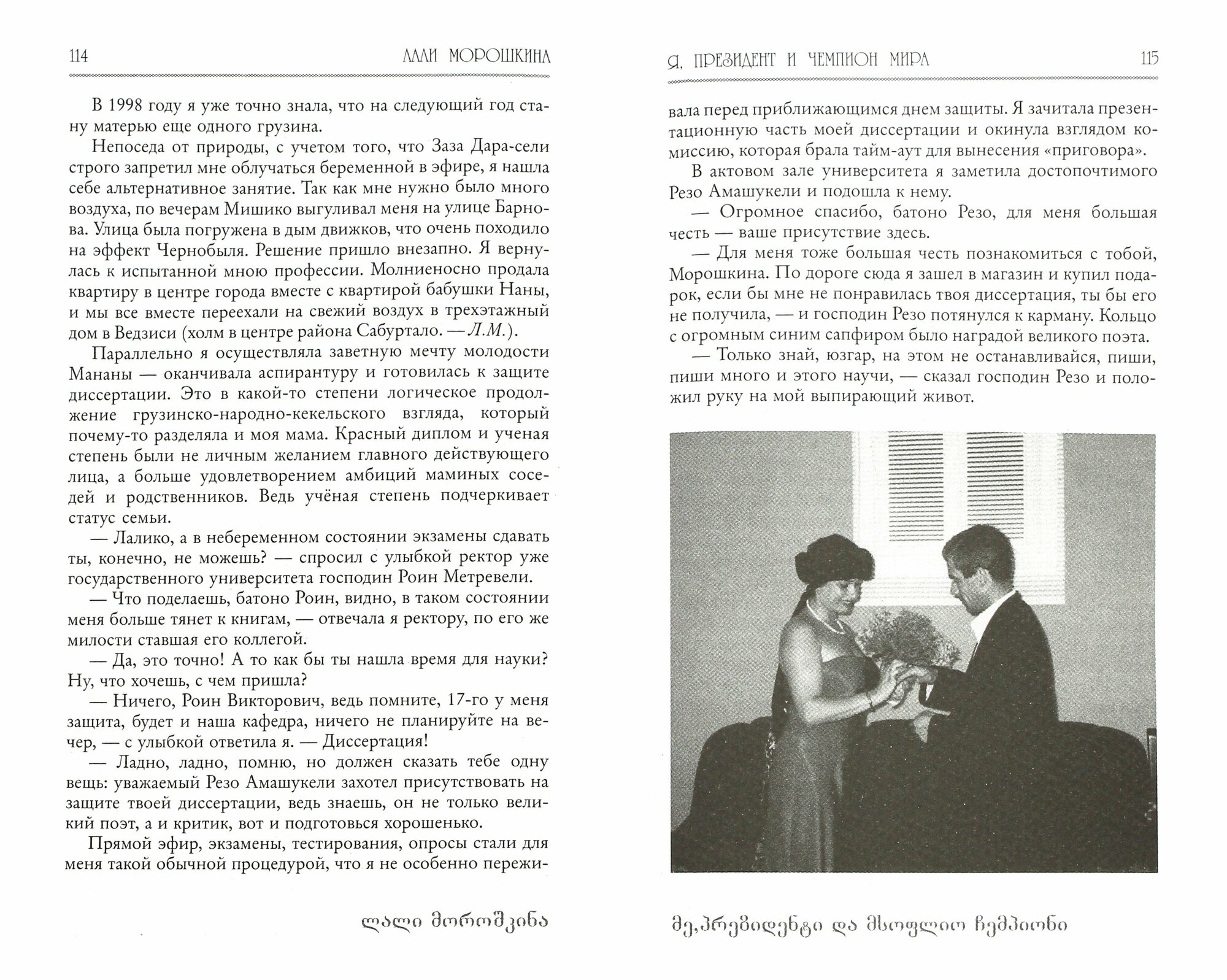 "Я, президент и чемпион мира" - это книга-автобиография, книга - свидетельство очевидца о Михаиле Саакашвили - одной из самых спорных фигур грузинской политики. Школьная подруга бывшего президента Грузии, Лали Морошкина, рассказала о скандальном пути становления Саакашвили в большой политике. Лали Морошкина - грузинский журналист и правозащитник. В эпоху Шеварднадзе она занимала должность заместителя министра по особым делам, а после ухода Михаила Саакашвили работала главным советником министра по исполнению наказаний.