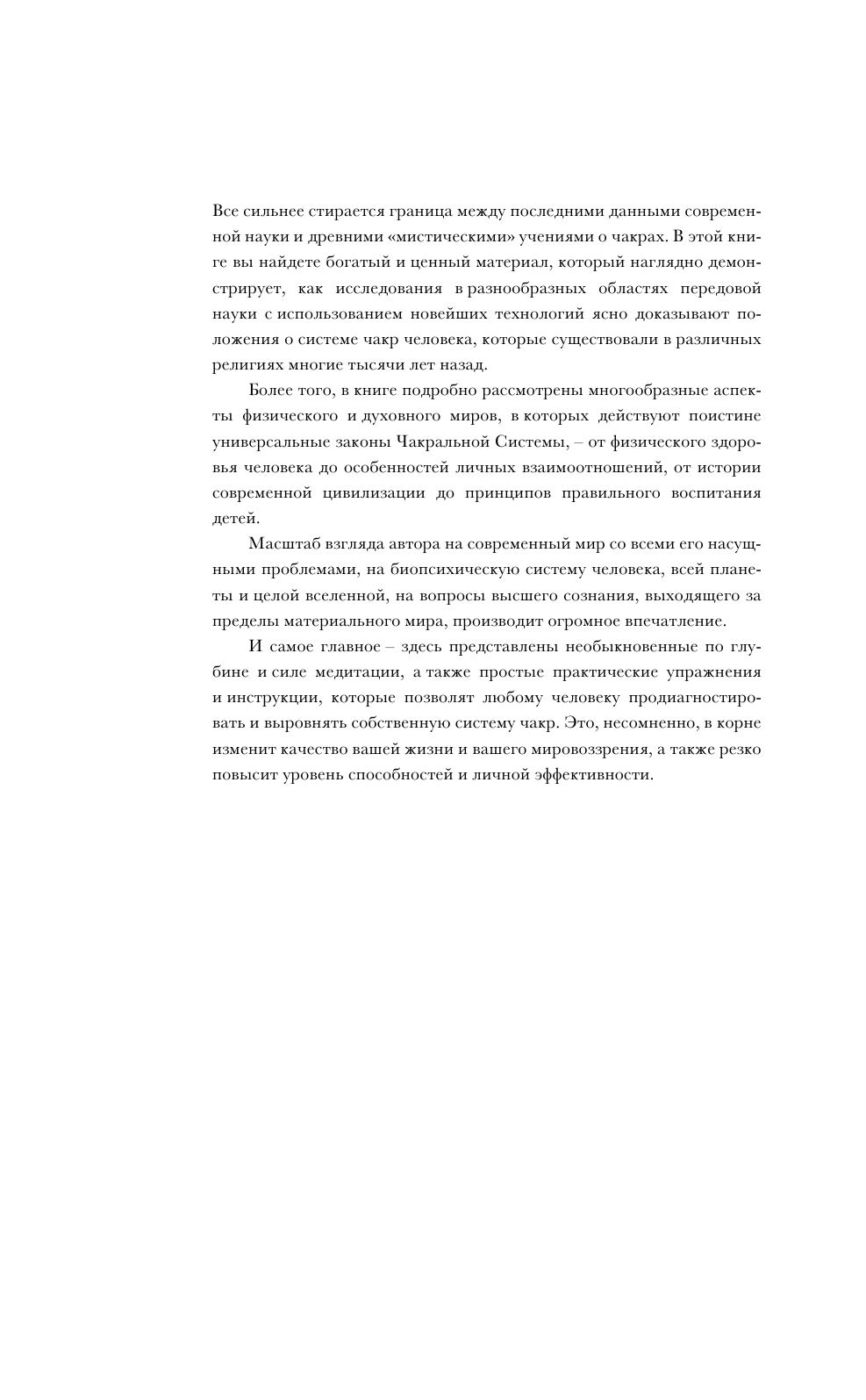 Книга состоит из 3-х частей: 1. Изучение системы 2. Путешествия через чакры 3. Соединяем все вместе. В книге подробно рассмотрены многообразные аспекты физического и духовного миров, в которых действуют универсальные законы Чакровой Системы - от физического здоровья человека до особенностей личных взаимоотношений, от истории современной цивилизации до принципов правильного воспитания детей. Масштабный взгляд автора на современный мир со всеми его существующими проблемами. Представлены глубокие и сильные медитации и практические упражнения, инструкции, которые позволяют любому человеку продиагностировать и выровнять собственную систему чакры. Все вместе может способствовать тому, что вы качественно измените свое восприятие и жизнь в целом, повысится уровень способностей и личной эффективности. Очень полезная книга для личностного развития, в которой можно найди все необходимые знания по чакрам, соответствующую символику, соответствие звуков, вибраций и многое другое. Интересен материал, связанный с тестированием своих чакр. Если у пары возникают проблемы, то они обязательно проявляются на уровне одной из чакр. Даны примеры, определения. В книге также содержатся черно-белые рисунки. В ней можно найти и авторские методы гармонизации и подпитки внутренней энергетики. Обложка качественная, твердая. Книга одна из самых значимых среди тех, которые были написаны о чакрах. Советую! Эта энциклопедия стоит своих денег!