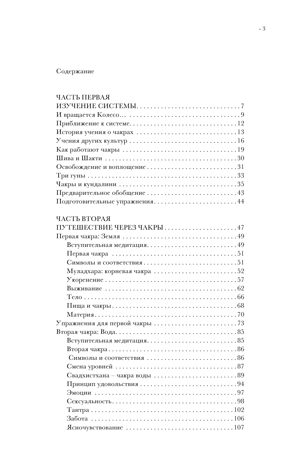 Подробное описание системы чакр и работы с ней. В первой части, Изучение системы, помещена такая информация, как История учения о чакрах, Учения других культур, Как работают чакры, Шива и Шакти, Освобождение и воплощение, Три гуны, Чакры и кундалини и др., даются подготовительные упражнения. Вторая часть, Путешествие через чакры, посвящена таким вопросам, как подробное рассмотрение каждой чакры, описаны Вступительная медитация, Символы и соответствия, упражнения, отличительные особенности конкретной чакры. Например, для Муладхара-чакры приводятся такие ассоциации, как Укоренение, Выживания, Тело, Пища, Материя. В третьей части под заголовком Соединяемся все вместе, рассматриваются такие темы, как Взаимодействие чакр, Чакры и отношения, Эволюционная перспектива, Воспитание здоровых чакр у детей. Для всех, занимающихся йогой или планирующих заниматься данной дисциплиной.