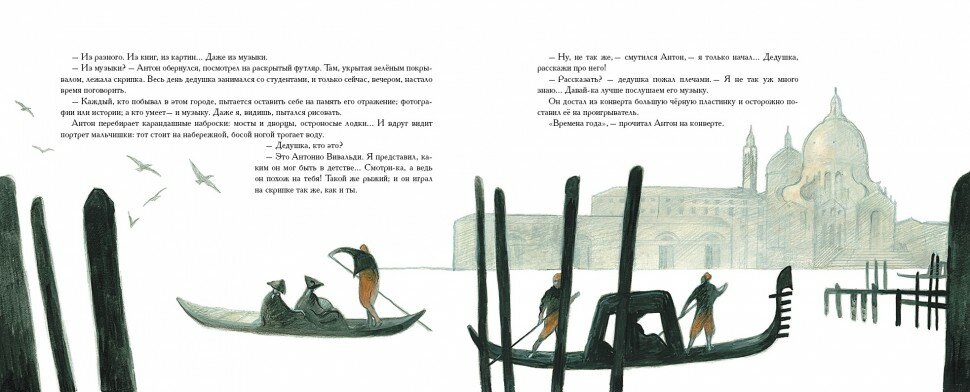 Во-первых, это Нина Дашевская - на чём, собственно, рецензию можно было бы и закончить, поскольку это имя в современной детской литературе - безусловный знак качества. И пишет она, как всегда, о том, что великолепно знает и чувствует - то есть "около музыки". На этот раз книга адресована не подросткам, а несколько более младшей аудитории, нежели обычно у Дашевской (не считая ранней книжки про гномов, конечно). С обозначением возрастной категории я затруднился: купили для шестилетки, развитой и активно читающей, но с интересом прочла вся семья, и категория 7 - 10 лет для этой книги - наверное, самая подходящая, хотя 5 - 11 - точнее. Жанр обозначить не менее сложно: здесь и история (по мотивам биографии Антонио Вивальди), и изумительно поданное введение в музыкальную культуру - ненавязчиво и очень красиво, завораживающе даже, в форме художественного повествования. Венеция, выраженная в музыке, и музыка, превращающаяся в рисунки Венеции... Проняло даже далёкого от всякой музыки меня - а любой ребёнок, прочитав, готов записаться добровольцем в музыкальную школу: благо, Ниной выстроена параллель между главным героем - современным мальчиком Антоном - и Антонио Вивальди, а потом параллельные прямые раз - и каким-то образом пересекаются. Отличный способ привлечь внимание детей, их тягу к музыке - развить и направить в нужное русло, а если её вдруг совсем нет - как минимум, дать базовые знания в этой области. Дополнительно, бонусом, включён познавательный компонент в виде статьи о Вивальди, и - очень уместно в данной книге - поэтические "иллюстрации к музыке", причём переводил Михаил Яснов, то есть тоже - знак качества. Оформление гармонирует с содержанием (хотя для меня оформление и не приоритетно).