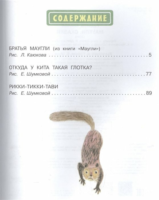 Книга Киплинга состоит из трех частей: "Братья Маугли (из книги "Маугли")", "Откуда у кита такая глотка?" и "Рики-Тикки-Тави". Иллюстрации к "Братьям Маугли" нам с дочкой очень понравились - очень красочные и понятные, как в известном всем с детства мультфильме. (художник Л. Каюков ). "Братья Маугли" - это немного сокращенный вариант самого "Маугли". Но мы ожидали таких же картинок и к остальным сказкам. Но там оказались иллюстрации совершенно другие, другого художника и для ребенка 5 лет совершенно непонятные. Очень жаль! Придется искать "Рикки-Тикки-Тавви" в другом исполнении. А так книга хорошего качества, подходит и для подарка - хорошая бумага и крупная печать.
