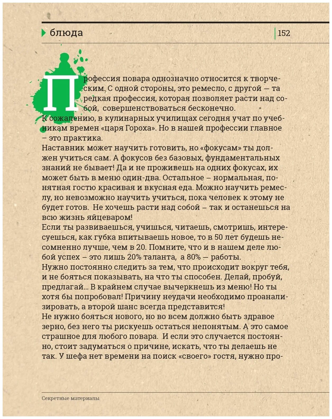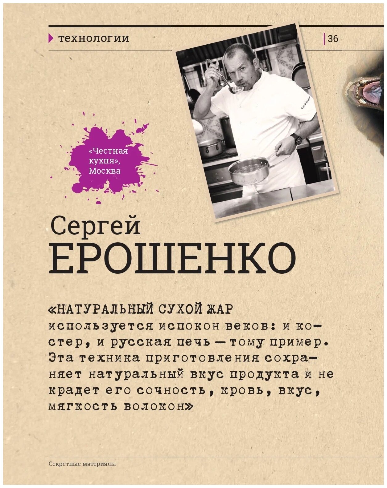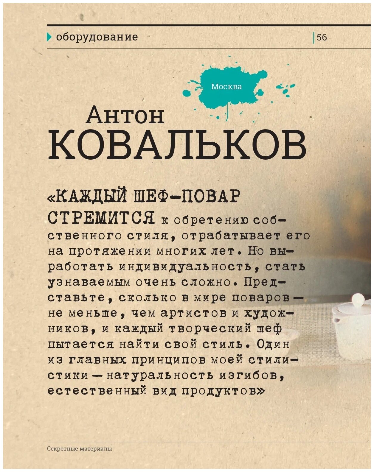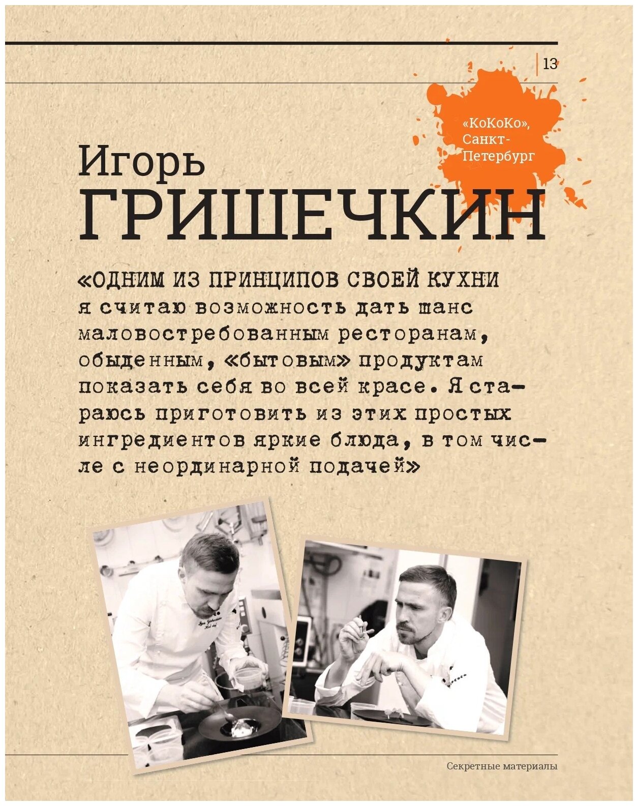 «Секретные материалы шеф-поваров. Впервые звездные шефы раскрывают секреты мастерства» — это гастрономическая книга, в которой самые прогрессивные шеф-повара делятся своими авторскими приемами и наработками сразу во всех ключевых направлениях: продукты, технологии, оборудование, сервировка, комплименты и рецепты. Данная книга — это полноценная коллекция идей, которые можно использовать на профессиональной кухне.