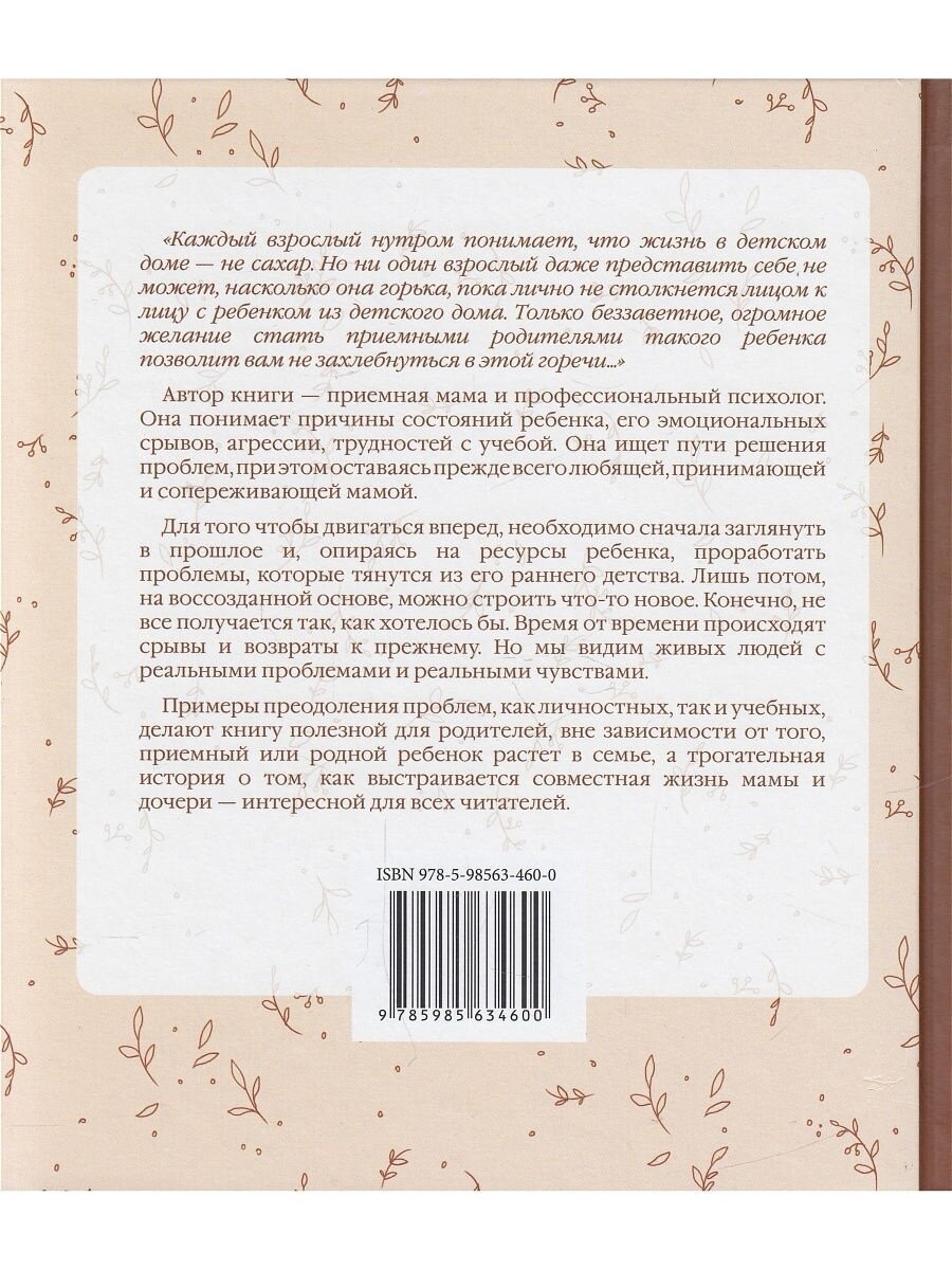 .Эта книга уникальна: шаг за шагом в ней отражается непростой процесс "отогревания" ребенка, попавшего из детского дома в приемную семью, процесс взаимной адаптации, полный радости и горечи. Автор - профессиональный психолог, поэтому она хорошо видит причины эмоциональных срывов, фантазий, агрессии ребенка, проблем с границами, общением и учебой. И, выделяя составляющие каждой проблемы, выбирает конкретные пути ее решения. Но при этом остается прежде всего любящей, принимающей, тонко чувствующей и сопереживающей мамой непростого ребенка.