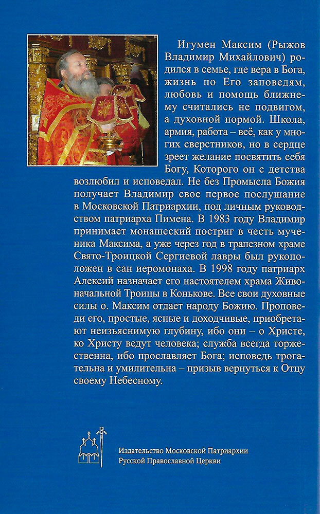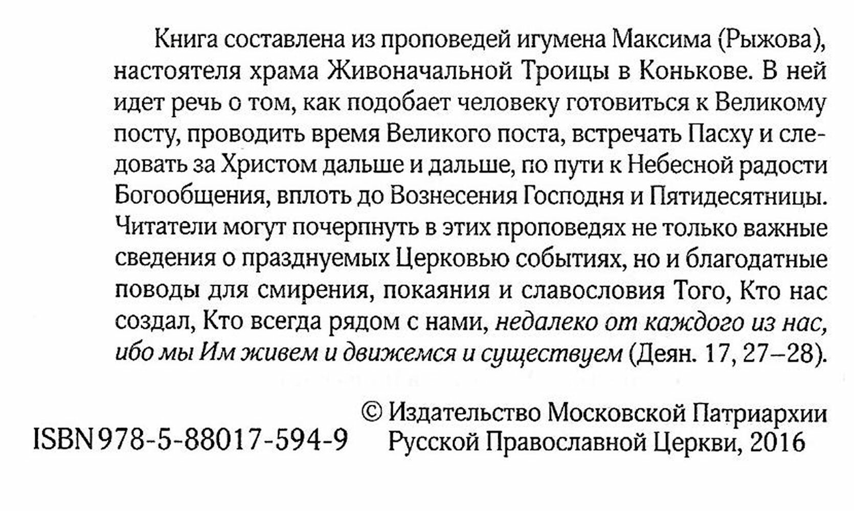 Книга настоятеля храма Живоначальной Троицы в Конькове игумена Максима (Рыжова) "Путь к Небесной радости: От Великого поста до Пятидесятницы" составлена из его проповедей. В ней идет речь о том, как подобает человеку готовиться к Великому посту, проводить время Великого поста, встречать Пасху и следовать за Христом дальше и дальше, по пути к Небесной радости Богообщения, вплоть до Вознесения Господня и Пятидесятницы. Читатели могут почерпнуть в этих проповедях не только важные сведения о празднуемых Церковью событиях, но и благодатные поводы для смирения, покаяния и славословия Того, Кто нас создал, Кто всегда рядом с нами, недалеко от каждого из нас, ибо мы Им живем и движемся и существуем (Деян. 17, 27-28).