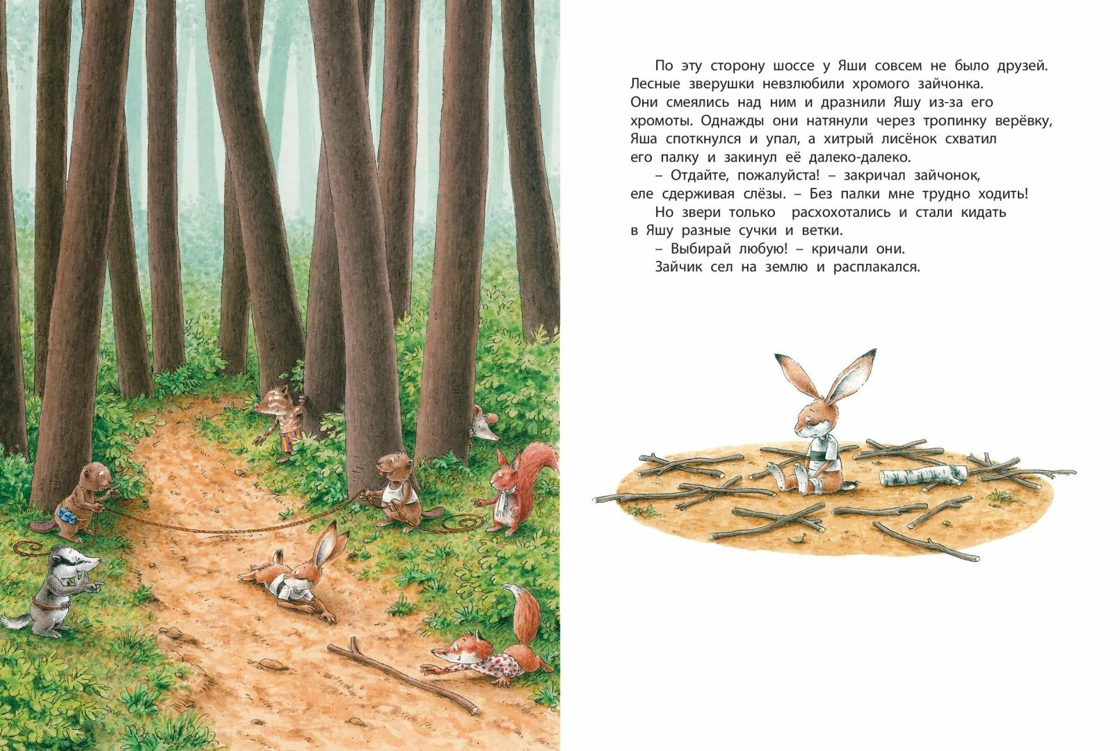 Зайчонок Яша оказался в чужом лесу, да ещё повредил себе лапку. Как же ему теперь попасть домой, к маме? Лесные зверюшки сначала смеялись над хромым малышом и дразнили его, но потом пожалели зайчонка и все вместе выручили его из беды. Это было непросто, но ведь известно, что вместе мы всё можем!