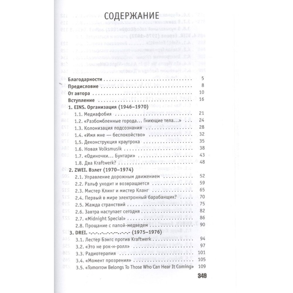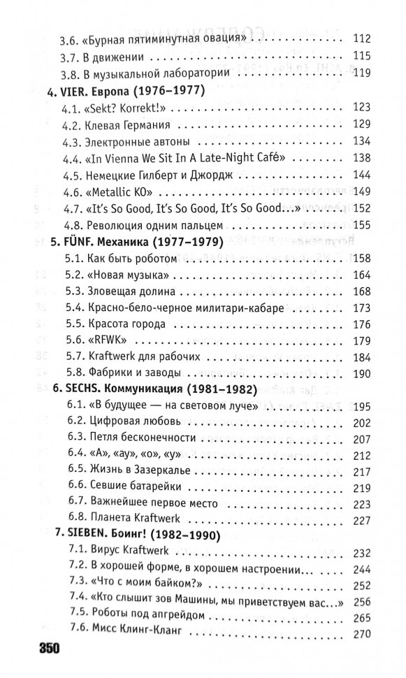 Произведение представляет собой рассказ о творчестве и самих альбомах группы, а также: создание трэков, работа на студии, процесс создания новой механической, а не акустической музыки с 1968 по 2012 год. Думаю русскоязычным фанатам Kraftwerk и людям сумевшим попасть на их редкие выступления в нашей стране , книга придётся по вкусу ибо на мой взгляд передает феномен и ауру maine machine Kraftwerk.