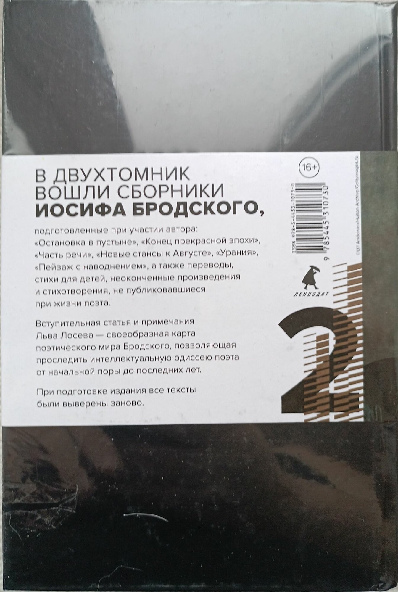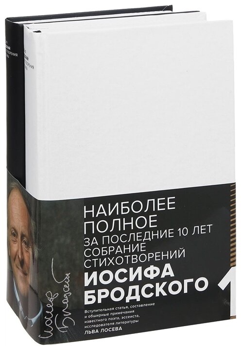 Хорошее издание: бумага белая и пахнет как "Властелин Колец", прямо детство вспомнила. Оформление красивое, минималистичные белая и черная обложки смотрятся достойно. Единственный текст -- на корешке -- название мелким шрифтом и логотип издательства внизу. То, что на картинке -- это суперобложка, одна на оба тома. Форзац, правда, в мелкий черно-белый рябчик, на него смотреть нельзя -- глаза вытекают. Есть ляссе. Тома тяжелые, по ≈750 страниц в каждом. Примерно четверть первого тома составляет предисловие, а одну треть -- примечания, последние стихотворения 1982-го года. Хороший выбор для подарка, правда, я сколько на него не смотрела, была уверена, что это ПСС -- публицистику придется докупать отдельно, но это уж я сама виновата.