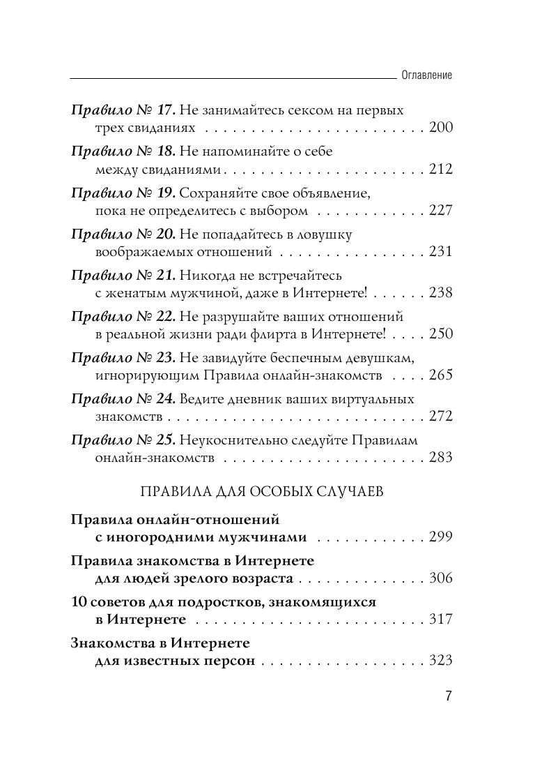 Знакомства в интернете имеют определённые преимущества основным из которых является то что ты сначала общаешься с человеком лишь потом видишь его в живую и если у тебя есть мозги можно на виртуальном этапе отсечь большую часть кавалеров не тратя бесценного времени и эмоций. 80% книги ( на мой взгляд) и так понятны ..хотя возможно кому-то надо ещё раз прочесть прописные истины