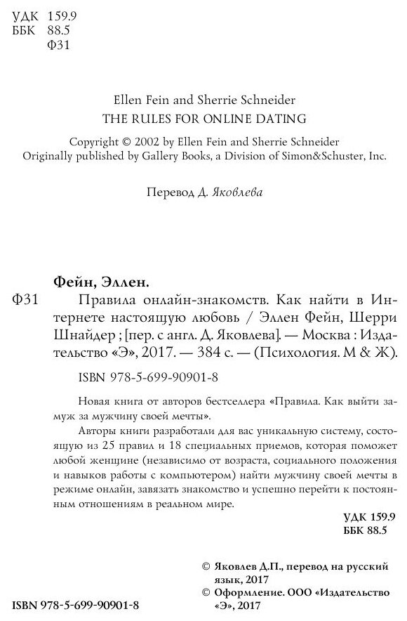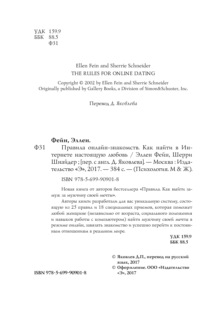 Правила онлайн-знакомств. Как найти в Интернете настоящую любовь (Фейн Эллен, Шнайдер Шерри); ООО "Издательство "Эксмо", 2017