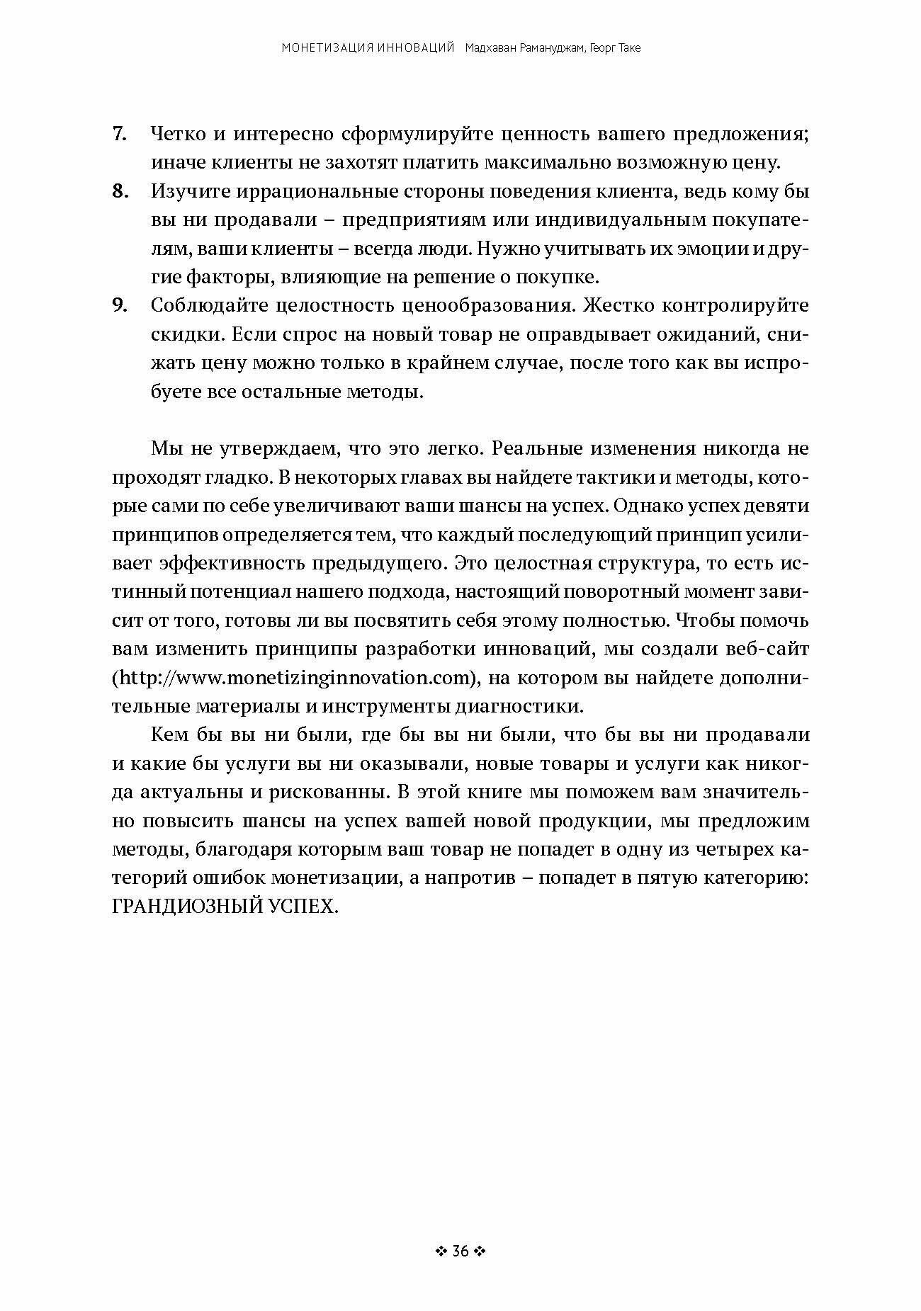 Если вы генеральный директор, или относитесь к исполнительному руководству, или являетесь частью команды, ответственной за инновации и разработку новых продуктов, эта книга для вас. С помощью специальных методик вы сможете сделать монетизацию инноваций частью ДНК вашей компании. Примеры показывают, как одни из лучших инновационных компаний мира, таких, как LinkedIn, UBER, Porsche, Optimizely, Drger, Swarovski и крупные фармацевтические компании, используют принципы, описанные в этой книге.