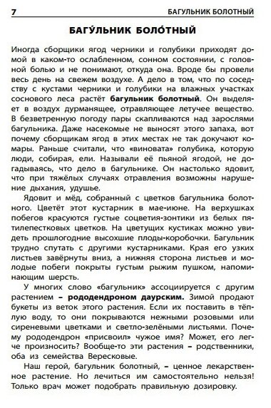 Хороший справочник для начальной школы, как и многие другие пособия из этой серии. В книге два раздела: в первом представлены основные ядовитые растения, встречающиеся на территории России, а во втором -опасные животные. Описание одного какого-либо вида помещается на одной страничке. Иллюстрации приведены на цветных вклейках в середине книге, иллюстрации хорошие, понятные.