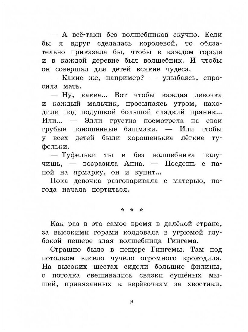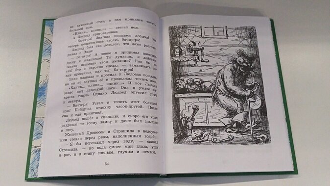 С интересом изучил книгу, сравнивая ее с книгой Детиздата 1941 г Иллюстрации –немного больше по размеру, поскольку и книга тоже побольше. В целом, рисунки идентичны, качество печати достойное. Есть и отличия - в новом издании имеется рисунок борьбы Железного Дровосека с Людоедом, а в старом есть рисунок, где Безрукие Коротыши пытаются помешать Элли попасть в страну волшебницы Стеллы. Указанные персонажи отсутствуют в новом издании – вместо них в этом эпизоде есть Прыгуны. Саблезубые тигры в старом издании называются тигромедведями - у них туловище медведя и тигровая голова.