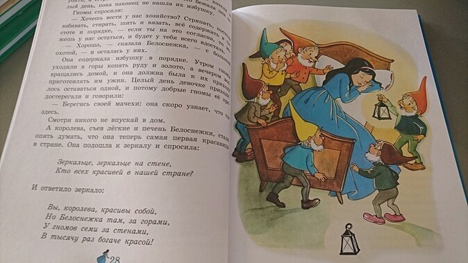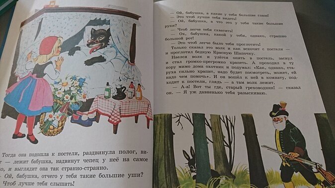 не однозначная книга.. Красная шапочка в иллюстрациях отличная, но сам рассказ ( отодвинь щеколду, отвори дверь . . а как они вспарывали брюхо волку- целая операция в подробностях. Чуть распороли- показалась красная шапочка , потом ещё немного и пр. . прям как будто волк рожает без наркоза , да потому ещё камни туда наложили и он отдал концы - жесть. Нельзя его была просто убить?) когда читаю некоторые сказки заменяю слова и сама сюжет немного меняю.. кому-то такой вариант может больше понравился , это их видение сказки. Только за красивые рисунки оставила и цена была с 40%скидкой.