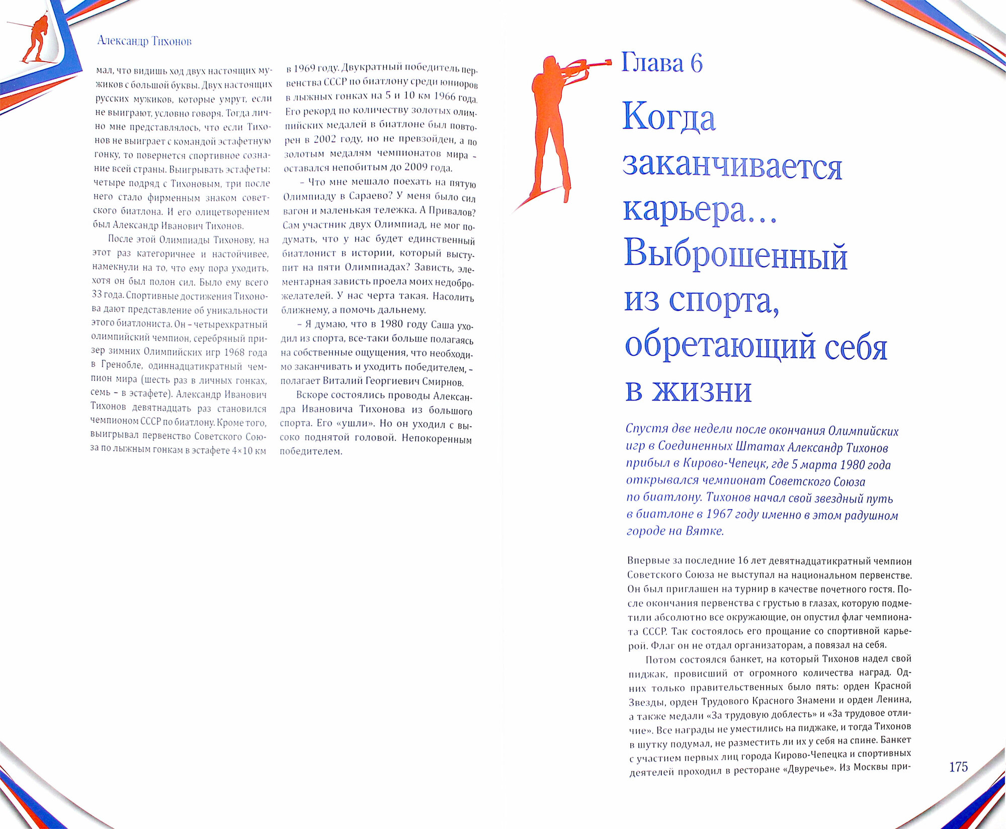 В новой книге об Александре Тихонове, четырехкратном олимпийском чемпионе и одиннадцатикратном чемпионе мира, освещается жизнь и спортивная карьера лучшего биатлониста ХХ века. О его непростой, но захватывающе интересной судьбе, борьбе и победах рассказывают друзья и коллеги, а также сам герой книги.