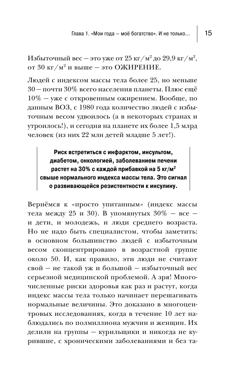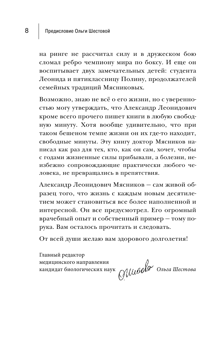 Эта книга мне понравилась больше всех!Скорее всего потому,что возраст уже за 60,полно всяких сопутствующих заболеваний помимо ССЗ и в ней Мясников все очень просто, по порядочку, очень понятно и доступно, с большой заботой о пожилых людях,можно сказать, как своим родителям, очень подробно описывает что делать, когда тебе плохо, какие лекарства и как принимать, для чего они служат, в каких случаях и на что заменить,какие анализы сдавать и что они показывают,дает рекомендации о физических нагрузках с подробнейшим описанием упражнений,о правильном питании и о многом-многом другом. Да -эта книга не для профессионалов и даже не для любого возраста, а вот именно за 50 и старше! Я очень много полезного для себя узнала,многое поняла, что нельзя пассивно относиться к своему здоровью, надо быть активной в любом возрасте и не ждать конца, глотая таблетки.Я советую всем пожилым,детям этих родителей купить и читать родителям эту книгу. Они Вам будут только благодарны и будут смотреть на жизнь в другом свете.