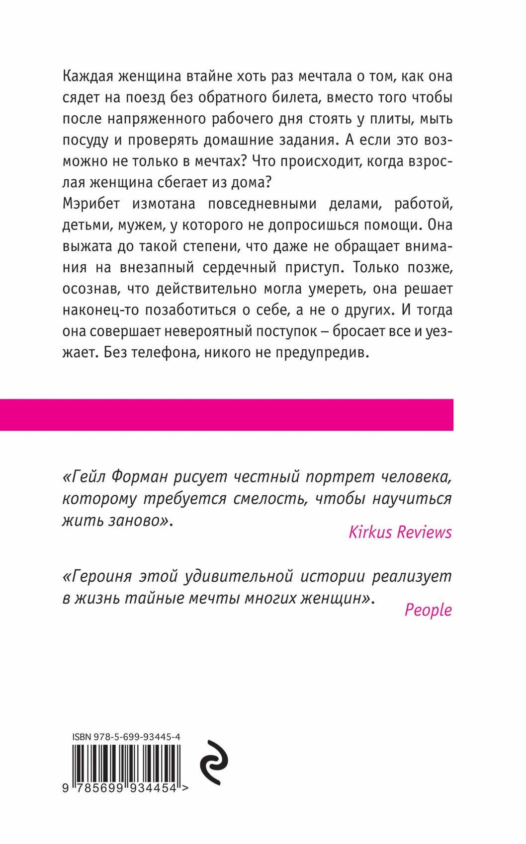 Каждая женщина втайне хоть раз мечтала о том, как она сядет на поезд без обратного билета, вместо того чтобы после напряженного рабочего дня стоять у плиты, мыть посуду и проверять домашние задания. А если это возможно не только в мечтах? Что происходит, когда взрослая женщина сбегает из дома? Мэрибет измотана повседневными делами, работой, детьми, мужем, у которого не допросишься помощи. Она выжата до такой степени, что даже не обращает внимание на внезапный сердечный приступ. Только позже, осознав, что действительно могла умереть, она решает наконец-то позаботиться о себе, а не о других. И тогда Мэрибет совершает невероятный поступок - бросает все и уезжает. Без телефона, никого не предупредив.