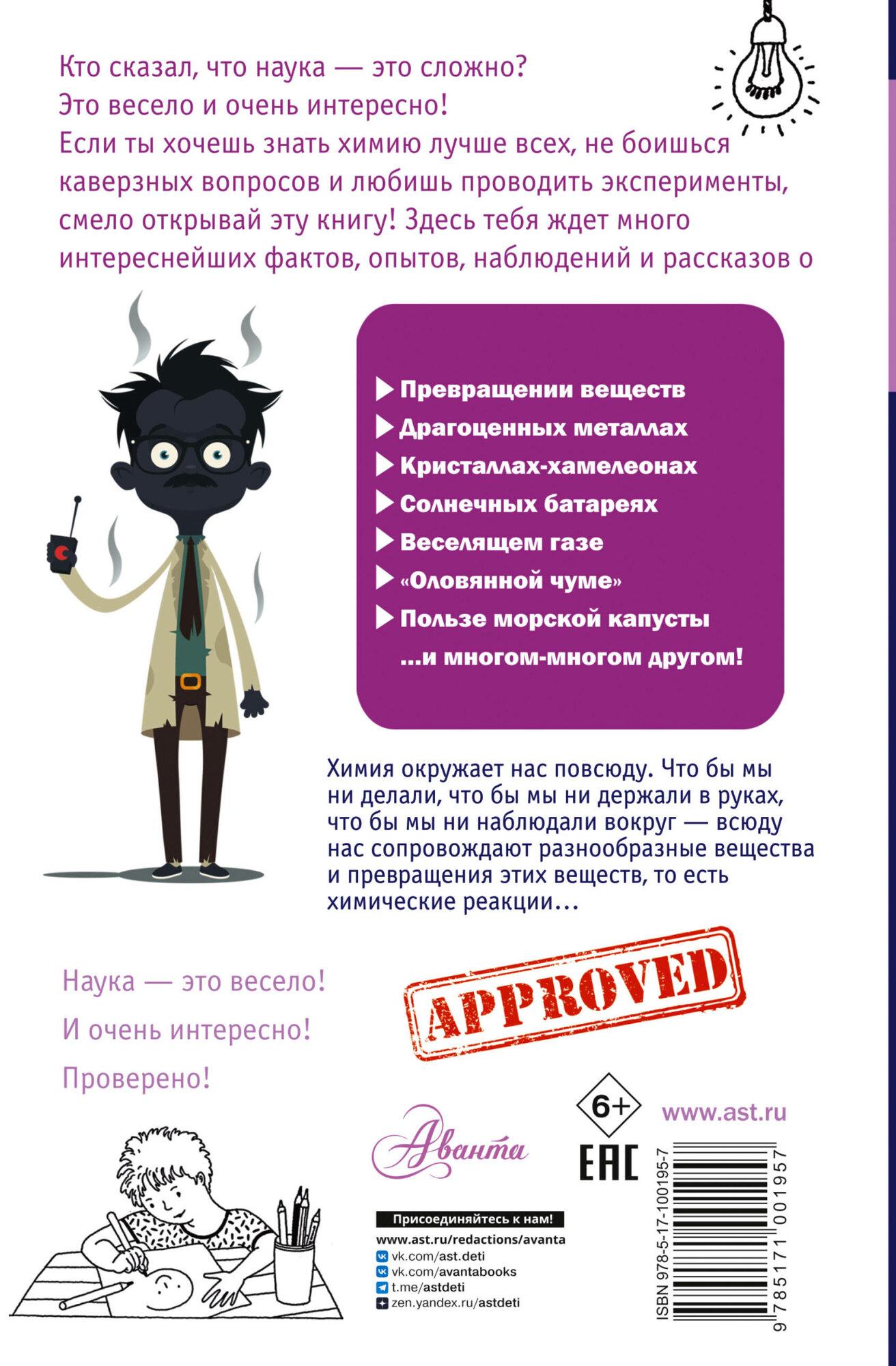 В книге Людмилы Алексеевны Савиной просто и занимательно рассказывается о химиках и открытиях, которые они совершили, о веществах и необычных химических реакциях, о кристаллах-хамелеонах, веселящем газе, пользе морской капусты и многом-многом другом, что имеет отношение к замечательной науке химии.
