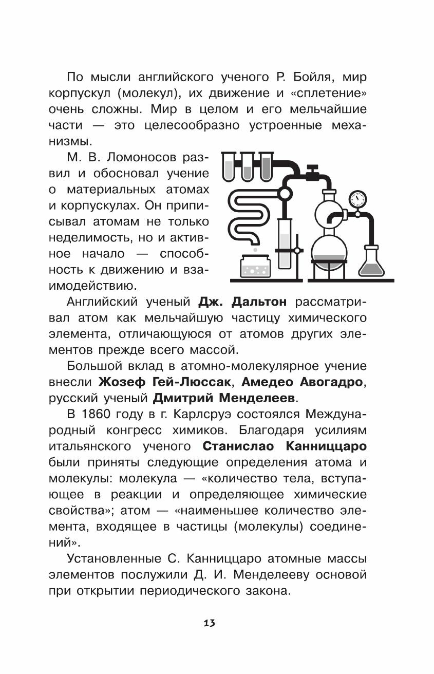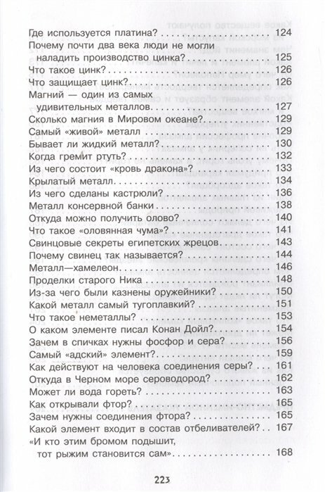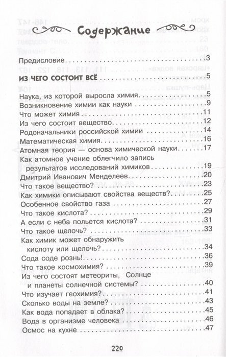Очень хорошая, содержательная книга. Разделена на небольшие главы. Подойдёт для детей от 10 лет и выше. Поможет при сдаче ЕГЭ, здесь много полезной информации, написанной в лёгкой доступной форме. Детьми будет легко восприниматься. Книга разделена на подглавы : 1.Из чего состоит всё. 2. Чудесные превращения. 3. Предметно-именной указатель. Для себя почерпнула некоторую новую информацию;-) Понравилось жизнеописание наших русских учёных М.В.Ломоносова и Д.И.Менделеева. Книга хорошо оформлена и большой плюс - это цена ;-)