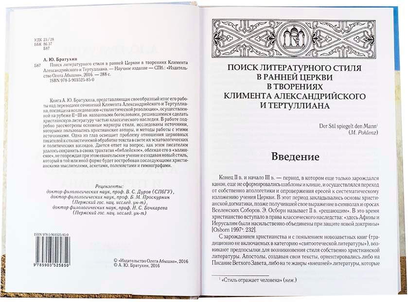 Книга А.Ю.Братухина, представляющая своеобразный итог его работы над переводами сочинений Климента Александрийского и Тертуллиана, посвящена исследованию "стилистической революции", осуществленной на рубеже II-III вв. названными богословами, решившимися сделать христианскую литературу частью классического наследия. В работе подробно рассмотрены основные маркеры стиля, исследованы источники, которыми пользовались христианские авторы, и методы работы с этими источниками. Одна из глав освещает проблему отношения церковных писателей к стилистической обработке текста в свете их эсхатологических и политических взглядов. Дается ответ на вопрос, как этим писателям удалось сохранить в своих трактатах "библейское", облекая его в "эллинское", не повреждая при этом евангельское учение и создавая новый стиль, который в той или иной форме будет востребован последующими христианскими мыслителями, аскетами, полемистами и гимнографами.