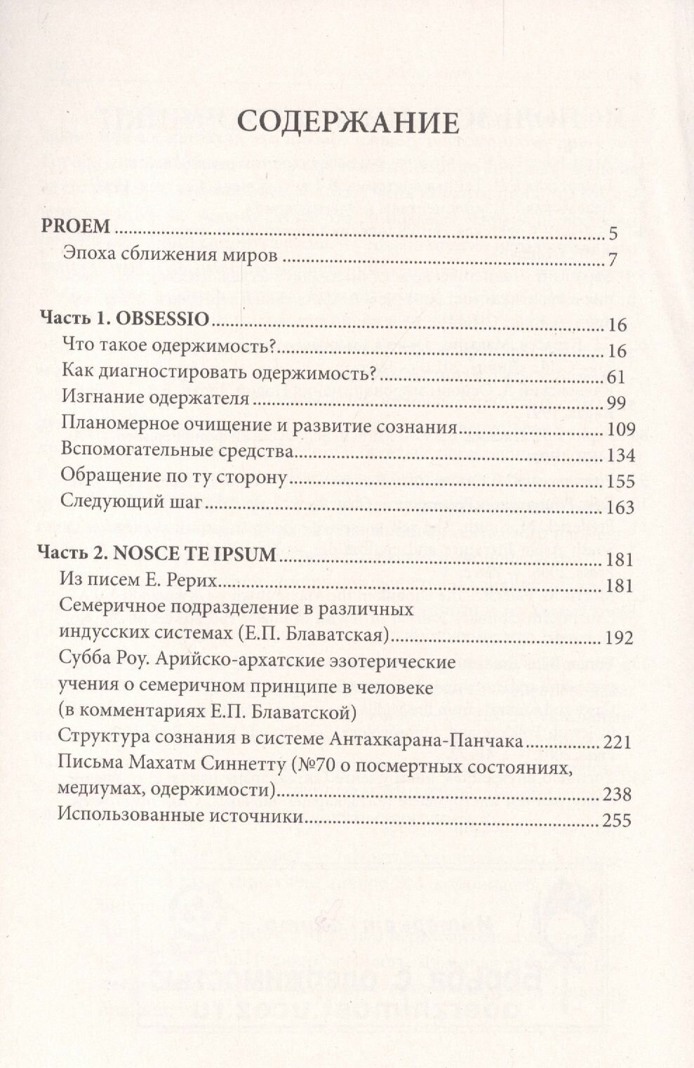 Цель этой книги - изучить разновидности одержимости, научиться определять присутствие (или отсутствие) чужеродных сущностей в человеке, а также найти методы избавления от них. Одновременно преследовалась и другая цель - показать, что наличие деструктивных сил не должно стать препятствием для духовного роста. Зная, что и как омрачает сознание, можно найти и то, что его очищает, возвышает и утончает. В этом плане исследование одержимости скорее будет промежуточным звеном, пройдя которое, люди откроют для себя новые горизонты развития. Книга рассчитана на широкий круг читателей, и написана так, чтобы создать логичную схему и дать общее определение одержимости в простой форме, доступной для понимания обычного человека, и в то же время удовлетворяющей своей полнотой специалистов, которые изучают философию, психологию, и в особенности медицинских работников.