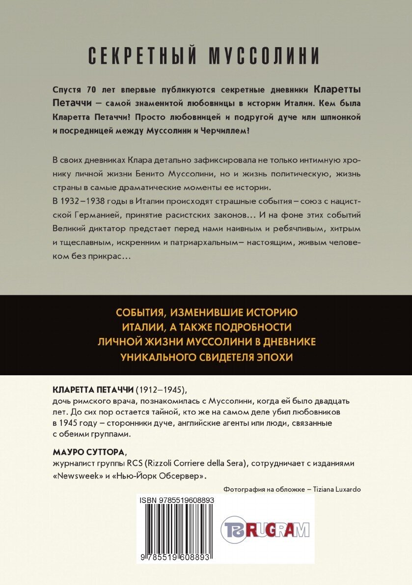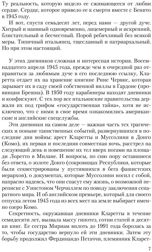 В своих дневниках Клара детально зафиксировала не только интимную хронику личной жизни Бенито Муссолини, но и жизнь политическую, жизнь страны в самые драматические моменты ее истории. В 1932-1938 годы в Италии происходят страшные события - союз с нацистской Германией, принятие расистских законов... И на фоне этих событий Великий диктатор предстает перед нами наивным и ребячливым, хитрым и тщеславным, искренним и патриархальным - настоящим, живым человеком без прикрас...