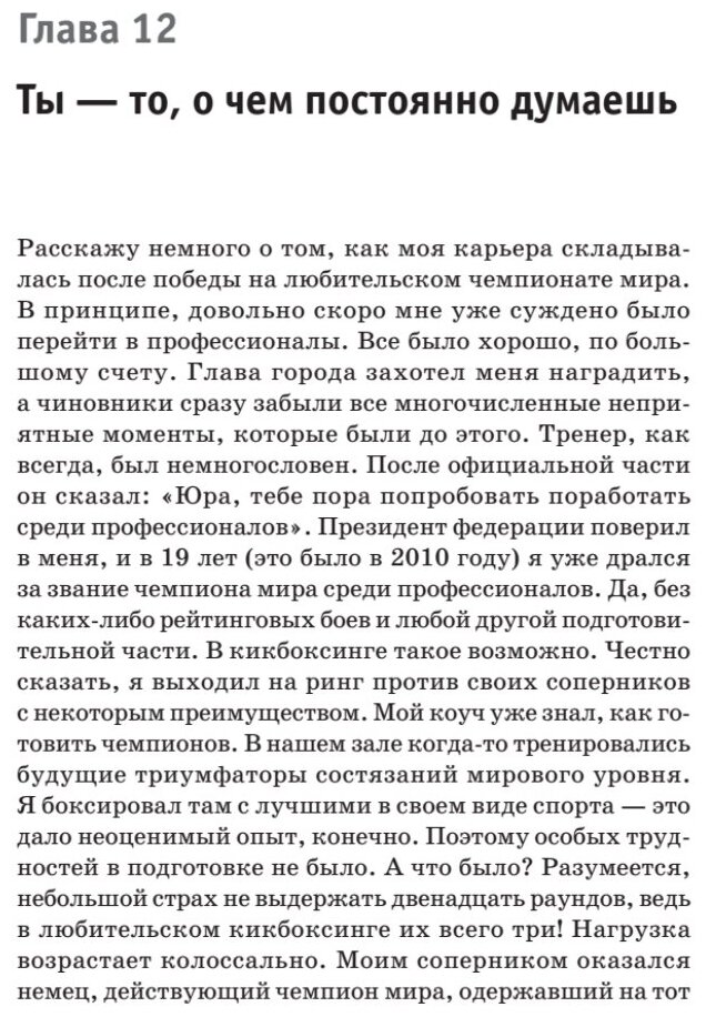 "Добро с кулаками" - это шоковая терапия для тех, кто хочет изменить свою жизнь, но не знает как к этой глобальной задаче подступиться. Бой с самим собой ведется каждое мгновение. И это главный бой в жизни любого человека - кикбоксера, бухгалтера, клерка, не важно чем он занят в жизни. В книге, которую вы держите в руках, подробно описан каждый шаг, помогающий вам не просто мечтать о великом, но и делать конкретные шаги по достижению осязаемых целей. Чем книга "Добро с кулаками" вам поможет? Что вас ждет на ее страницах? А) Вы сможете определить для себя высшую цель, которая будет придавать энергии одним своим существованием. Б) Вы получите универсальные схемы/приемы/техники мышления, которые помогут вам в жизни - от взаимоотношений в семье до переговоров по бизнесу. В) Вы сможете побороть самых опасных внутренних демонов, которым нельзя дать загубить свою жизнь (лень, фрустрация, страхи, звездная болезнь). Г) Вы научитесь правильно реагировать на поражения (это жизнь, они иногда случаются у всех) и извлекать из них максимум пользы. Д) Вы узнаете историю простого парня Юры Трогиянова, у которого была одна большая мечта и который несмотря на все трудности претворил ее в жизнь.