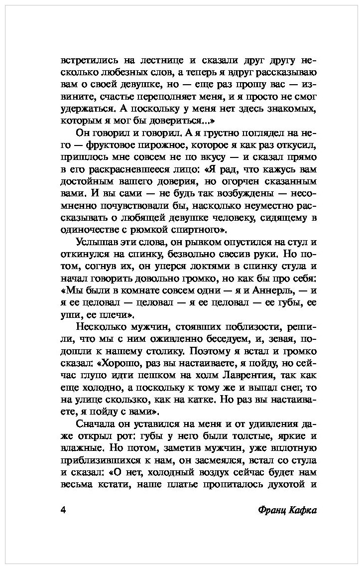 Это не книга. Это психологическое пособие. Кафка – тонкий великолепный психолог! Для тех, кто проживает чужую жизнь. И для всех, кто хочет понять свою. Не устаю приходить в глубокий восторг от его книг! Его произведения, как воздух, настолько не заметно проникают в каждую твою клеточку, в самый дальний уголок твоей сущности и остаются навсегда. Самый длинный след в вашей душе. Самое глубокое осознание. Вы никогда не сможете определить каково ваше однозначное отношение к его творчеству. Так как каждый день, после прочтения его книг, и, даже, через 10 лет, вы будете чувствовать разные ощущения. Его книга будет жить, в какой-то частичке вашей души всегда.